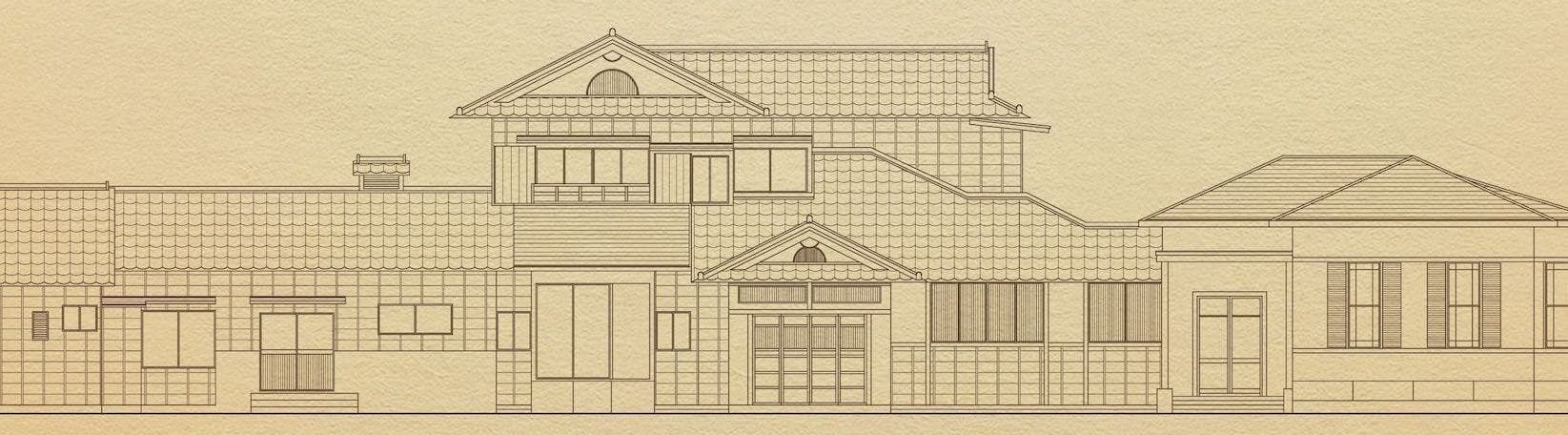 建物は、木造二階建の和館とサンルーム付きの洋館から成る近代邸宅建築です。和館の玄関の右側には洋風の応接間、奥に広がる庭園に面して、廻らし雁行型(がんこうがた)に配された座敷が並んでいます。洋館にも玄関が設けられ、暖炉や出窓が備えられて、庭園側にサンルームが張り出しています。