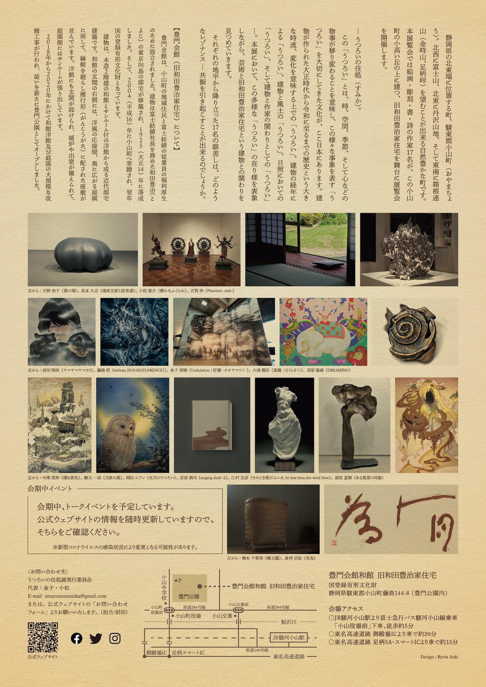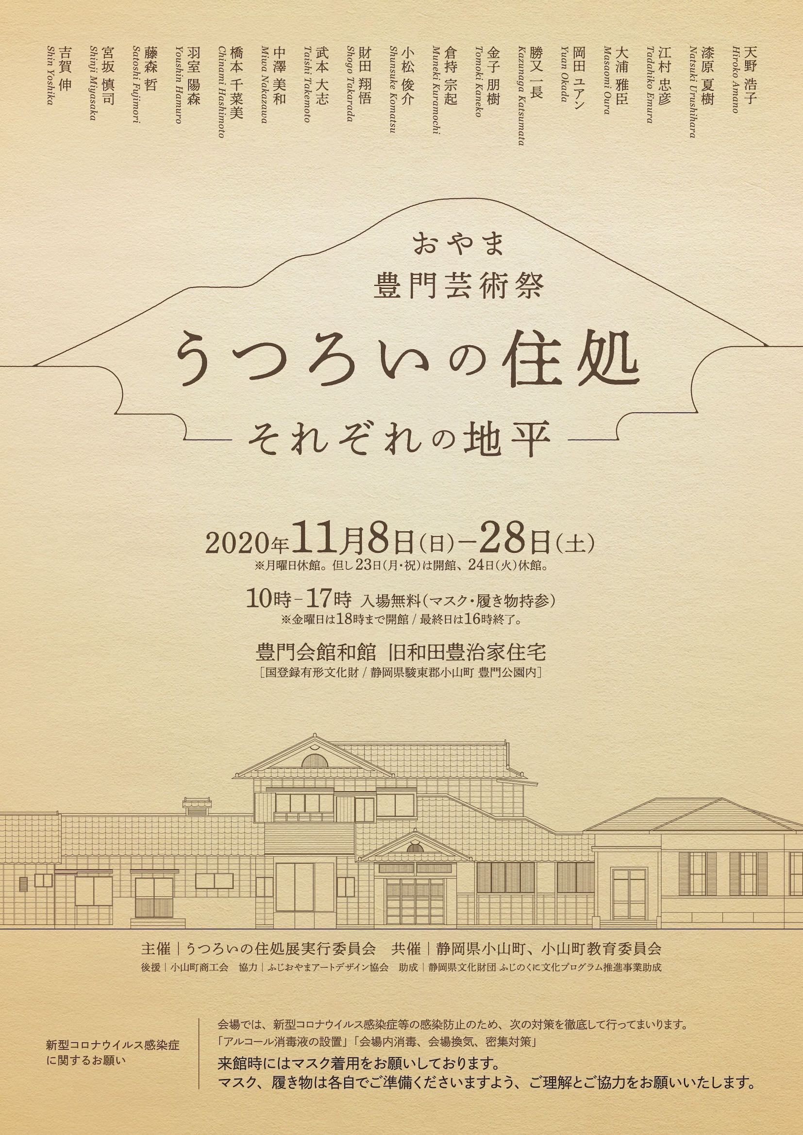 私たち17名の作家は富士の麓にある、豊門会館を舞台に芸術祭を開催いたします。豊門会館は、静岡県駿東郡小山町の豊門公園内にある建物です。豊門会館とは、小山町発祥の紡績会社「富士紡績」(現:富士紡ホールディングス株式会社)の経営危機を救った和田豊治が自身の邸宅を東京から小山町に移築したことで今に伝わります。2019年に豊門会館の改修工事が完了し、2020年同公園内の庭園と西洋館の改修工事が完了し全面的にリニューアルオープンしました。私たち17名の美術作家は純粋に建築空間の魅力に惹かれ、この空間で作品を展示してみたいという思いから展覧会を企画しました。