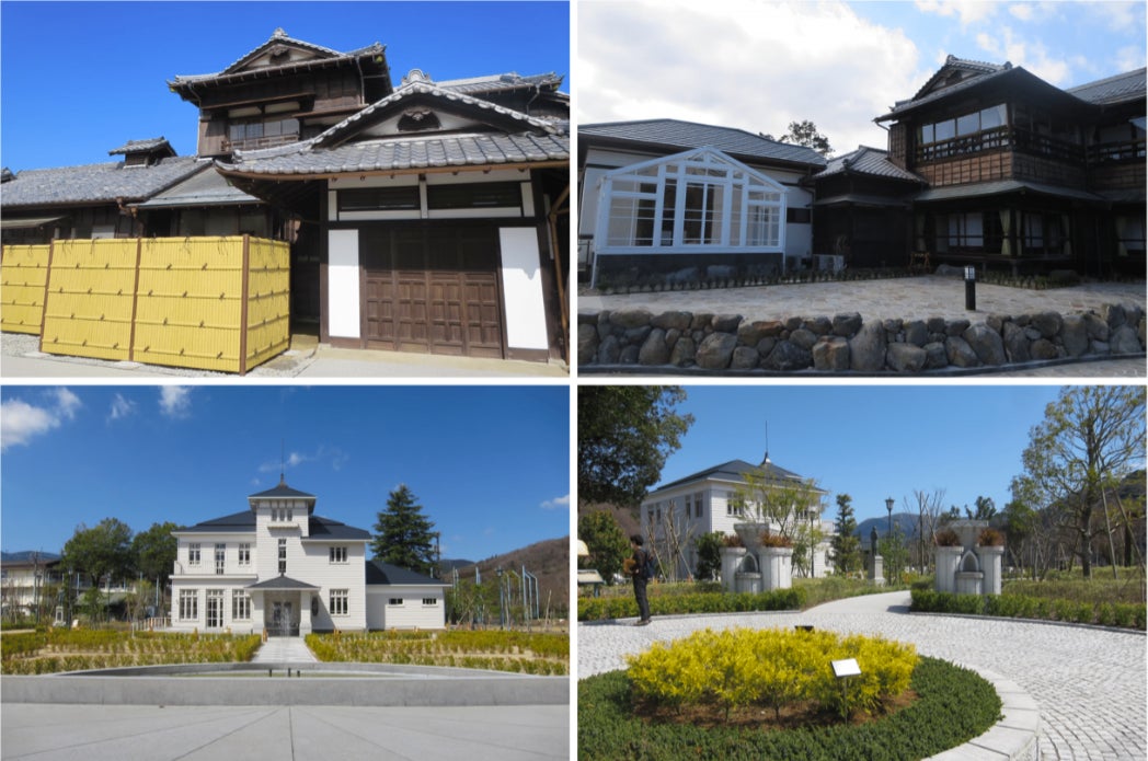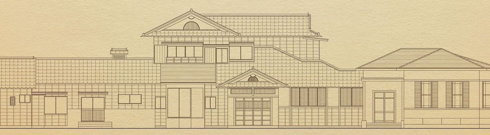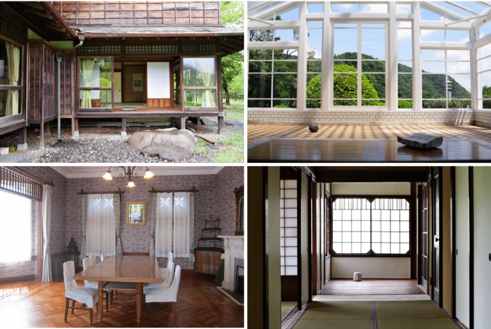 建物は、木造二階建の和館とサンルーム付きの洋館から成る近代邸宅建築です。和館の玄関の右側には洋風の応接間、奥に広がる庭園に面して、廻らし雁行型(がんこうがた)に配された座敷が並んでいます。洋館にも玄関が設けられ、暖炉や出窓が備えられて、庭園側にサンルームが張り出しています。