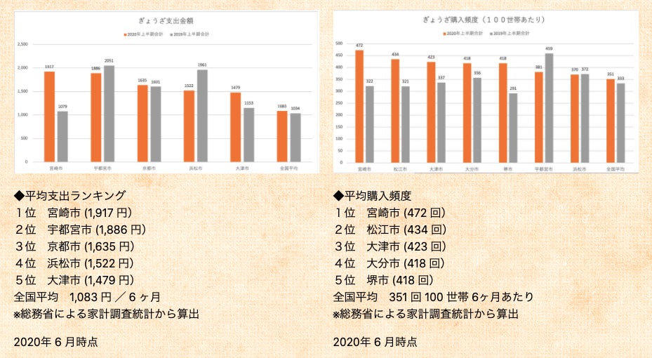 2020年6月時点のぎょうざ平均支出金額と購入頻度。宮崎市が1位です!!