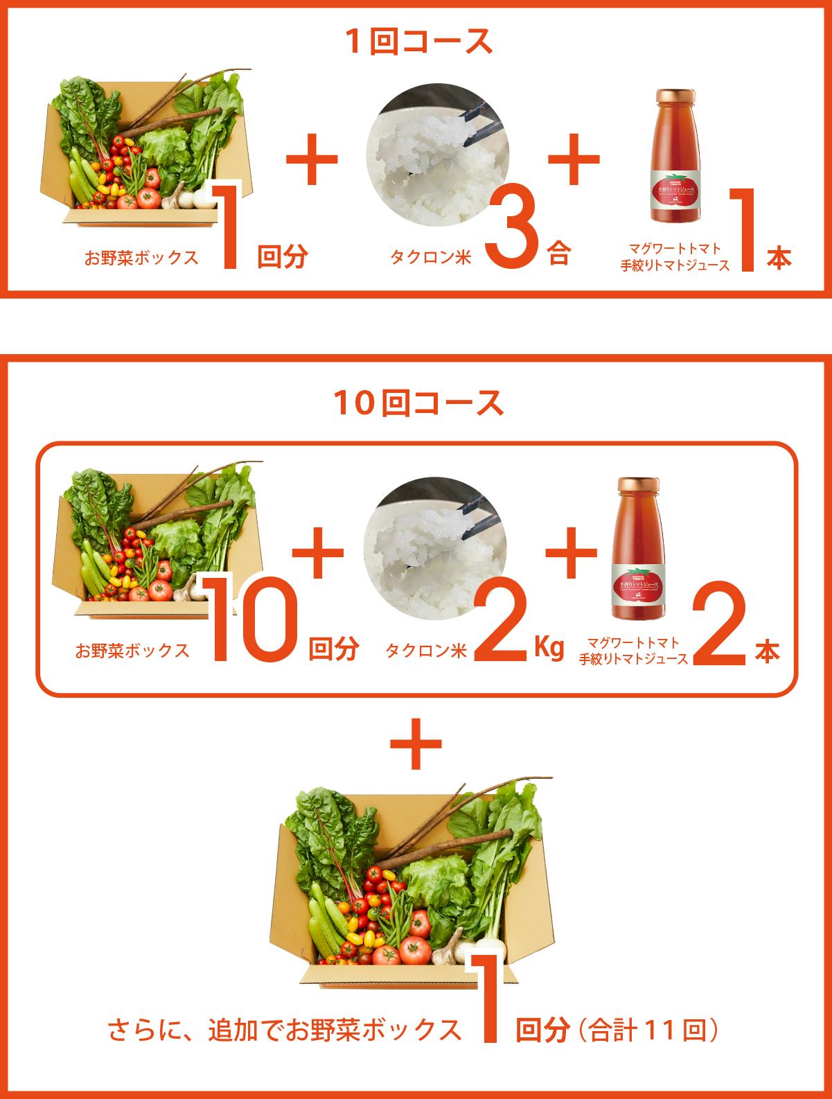 まずは減農薬&減化学肥料で作られた本物のお野菜のお味を試してみたいという方には【1回コース】がおすすめです。なお、協力農家の方々は季節によって変わるので、隠れた農業大国・青森が育む多種多様なお野菜を召し上がりたい方には【10回コース】がおすすめになります。