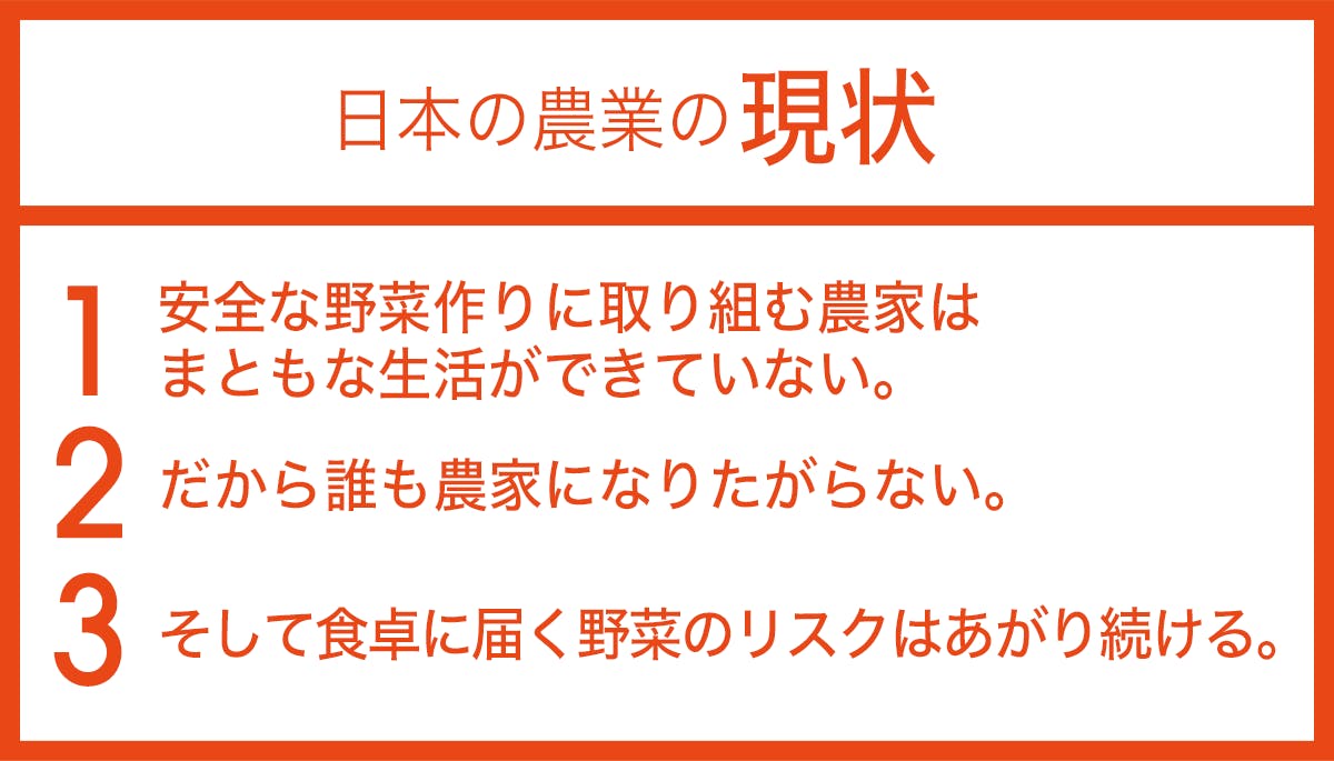 2人とも、できる限り安全な農作物を栽培し、その流通網の開拓にもチャレンジして新しい農家のあり方を模索し続けている、真面目が取り柄の農家です。そんな2人が、なぜ「日本の農業を変える」なんて大仰なことを言い出したのか?それは、日本の農業が今まさに危機的状況に瀕していて、いよいよ見過ごせない段階になっているからに他なりません。