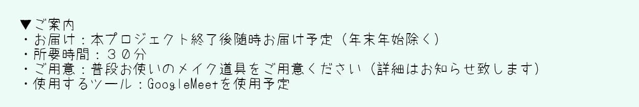 新婦の緊張をほぐすことも得意なメイクアップアーティストが贈る、このご時世ならではのレッスンです。「オンライン、画面で映えるワンポイントメイク」もしくは「印象が良くなるマスクメイク」のどちらかお選びください。
