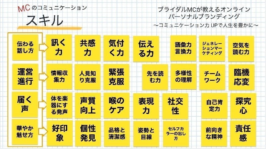 打合せの段階で発揮するスキル、ご披露宴当日の進行で発揮するスキル、書き出してみるとたくさん出てきました!やっぱり、ブライダルMCのスキルって奥深いです。