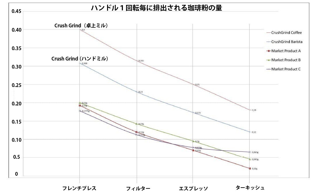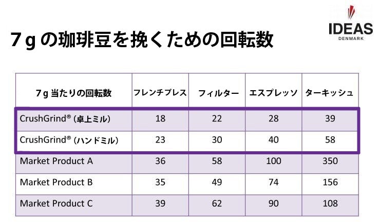 CrushGrind Coffeeはその独自構造により、同価格帯のコーヒーミルと比較し3倍~5倍の効率で豆を挽くことが可能です。