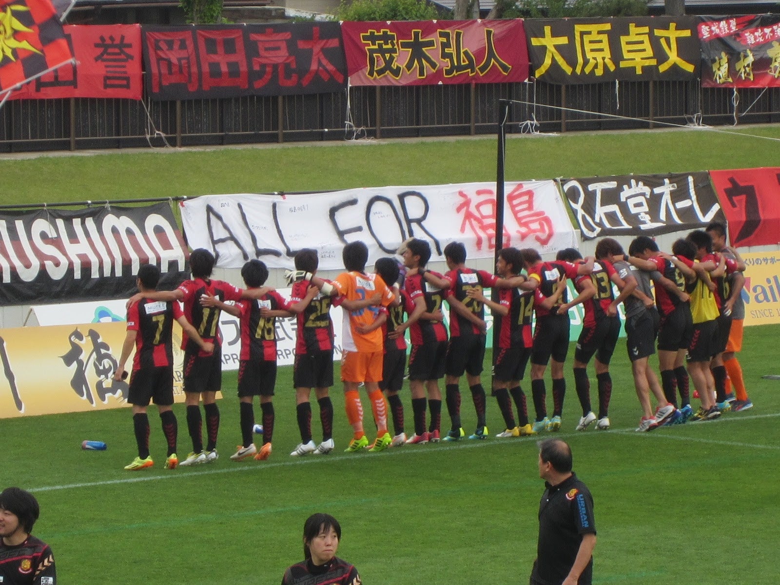2011年2月、福島県経済界の有志が中心となって新しい運営会社となる株式会社AC福島ユナイテッドが設立されました。その1か月後の3月、東日本大震災および福島第一原子力発電所事故の不安から多くの選手が退団したため、現役を退きコーチを務める予定だったキム・キス、柳原裕が現役に復帰した。福島県内での試合が禁止されたため、他県でホームの試合を開催する事を条件に東北リーグの参加を認められ、東北リーグ1部で初優勝を果たします。しかしながら、第35回全国地域サッカーリーグ決勝大会は1次ラウンドで敗退し悲願のJFL昇格なりませんでした。