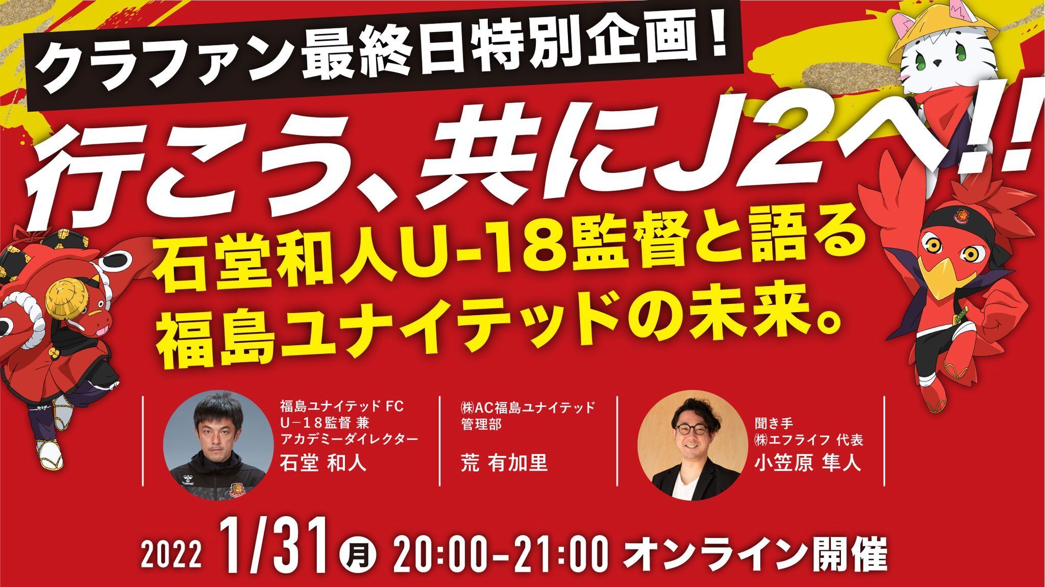 おはようございます、福島ユナイテッドFCです。カウントダウンあと1日!!投稿10回目!!投稿お待ちの皆様、お待たせしました、、、ちょっと遅刻しちゃった。。。なぜ? 皆様のおかげで、返礼品もSOLDOUTが続出!!新設選手用ロッカー寄贈者ネームプレート貼付権やお気持ちクラファンも好評で本当にありがとうございます。メッセージも皆様の想いが伝わってきて、選手もスタッフもやる気に繋がっております!!じっくり読んで、嬉しくて、感動してたらあっという間に。。。 本当にすみません!と、ありがとう!! やっぱり皆さんの声が一番の特効薬!!選手もスタッフも話してますが、やっぱりチャントが聞きたいですね~♬スタジアムが揺れる皆さんのチャントは、ほんとに感動します!!ここ数年、応援に制限があってなかなか難しいところではありますが、新選手は自分のチャントを聞いたことがないし、もちろん応援していただいてる皆様も伝える手段に制限は寂しいですよね。。。ぜひ、制限解除した時にはスタジアムで歓喜の時を共に皆様と喜び合いたい!!それまでは、ちゃ~んと感染対策を守って(笑) 頑張りましょう!!ご協力お願いします!!そして、明日のトークイベントもお楽しみに!!出演者は皆さんが知ってるあの2人!ぜひ拡散いっぱいして参加いただいて、熱いメッセージをお願いします!【Timetable】20:00~ ご挨拶「石堂和人監督と語るチームの未来」他クラウドファンディングリターン紹介21:00~ 終わりのご挨拶※タイムテーブルは若干、延長や前後する可能性がございます。予めご了承ください。【視聴方法】お時間になりましたら、以下のいずれかのページにアクセスすればご覧いただけます。(1)福島ユナイテッドの公式twitterアカウントからtwitter liveで https://twitter.com/fufc_staff/(2)福島ユナイテッドの公式FacebookページからFacebook liveで https://www.facebook.com/fufc.jp/(3)福島ユナイテッドの公式YoutubeアカウントからYoutube liveで https://www.youtube.com/channel/UCvGn9vzK4pTe1WhoMHp38sQさあ、最終日まであと一日!!気合い入れてお届けします。それでは、今日のカウントダウンはこの選手!!https://youtu.be/3jL3ojq9Ousご視聴ありがとうございます。ちょっとガチガチでしたが、目ヂカラいいですね!ピッチでの表情やプレーが楽しみですね!新チーム、選手を支えるのはご支援いただく皆様です!明日はもう最終日、もう最終日です!!朝から1日、追ってご案内いたしますよ!!月曜日ですが、乞うご期待ください!!ONE UNITED!!プロジェクト終了まで1日!引き続き皆様のご支援を心よりお願い申し上げます!★只今、支援額5%OFFクーポンが発動中!!下記、詳細をご一読いただいてぜひご支援検討を何卒よろしくお願いします。【クーポン内容】・クーポンコード:2022_4649・クーポン割引率: 支援額から5%OFF・最大割引額:なし・利用可能期間:2022年1月24日(月)12時00分〜1月31日(月)23時59分まで・クーポン利用上限枚数:期間中お1人様1回まで【クーポンの使い方】プロジェクト支援画面のクーポンコード欄にクーポンコード「2022_4649」をご入力下さい>>クーポンご利用方法の詳細はこちら↓https://help.camp-fire.jp/hc/ja/articles/900003910726【ご利用時の注意点】・クーポンは他のキャンペーンとは併用いただけません・クーポンコードを支援時に入力いただいたお申込みのみ割引対象となります。さかのぼっての割引はいたしません。ご了承ください。