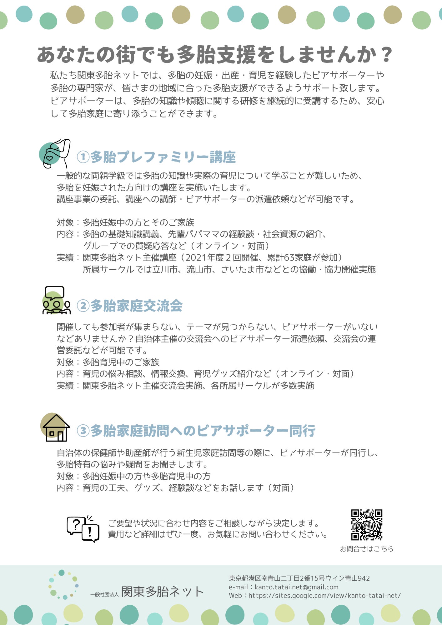 関東多胎ネットでは、サークルのない地域での立ち上げ支援から、交流会の委託事業、講座依頼などもお受けしていますので、是非お問い合わせくださいね。