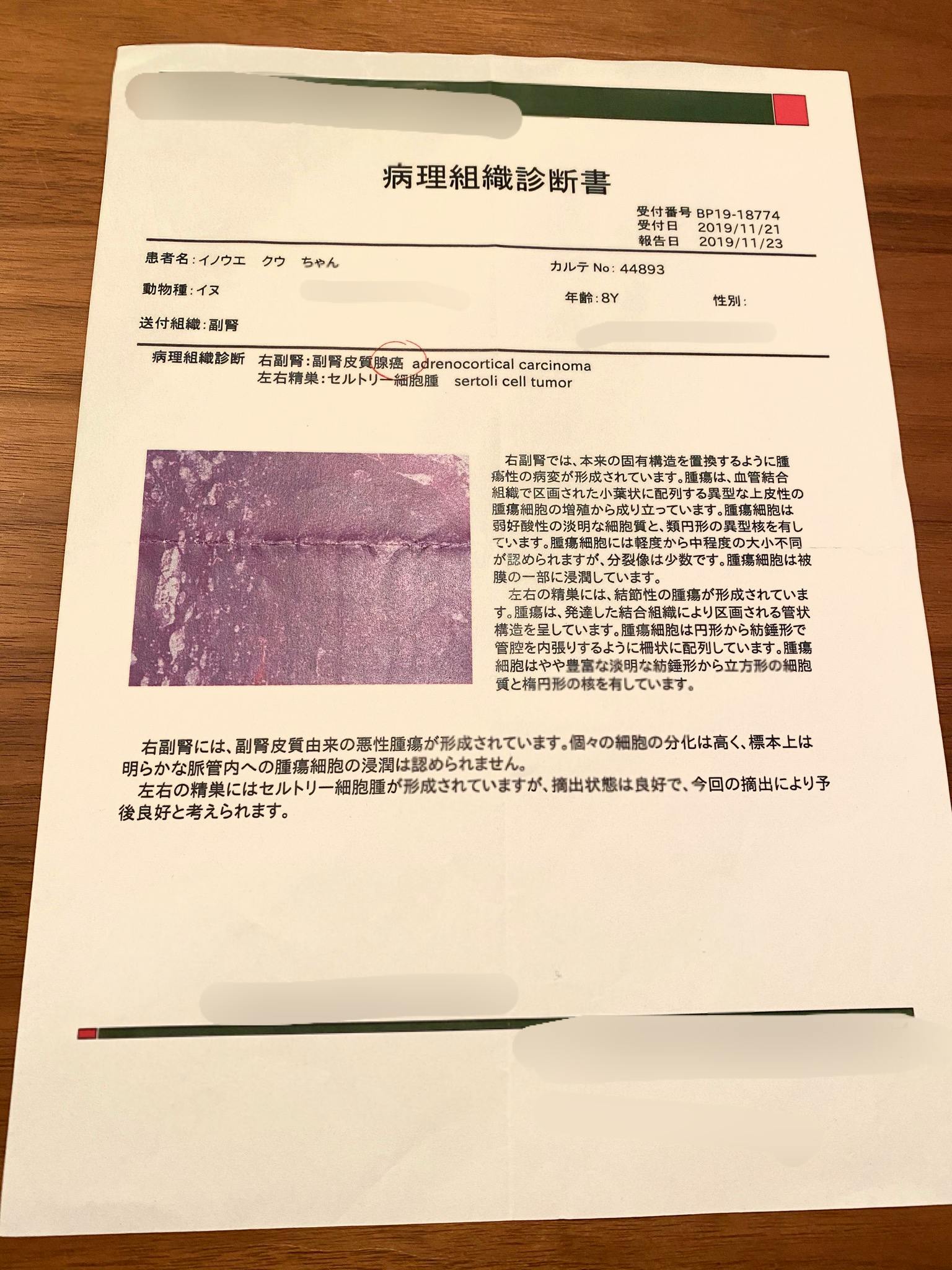 その後、大きな病院で10月27日にCT検査・X線検査等を受け、副腎に腫瘍があることが判明いたしました。そして11月23日より入院し、手術(副腎切除術)を行い無事成功、11月29日に退院いたしました。