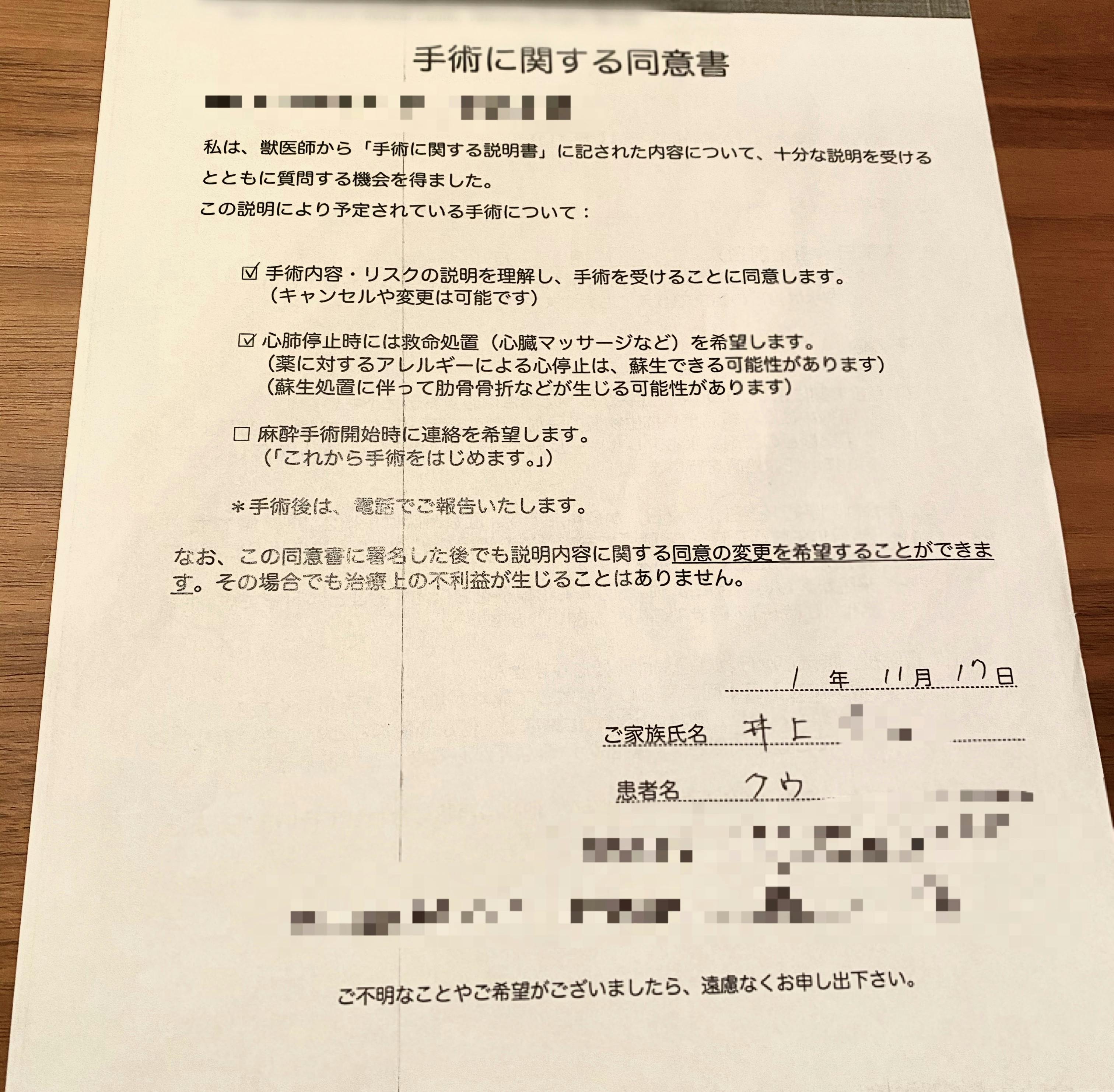 手術の同意書それからは体調は良好で、以前と同じように元気に遊んでいました。