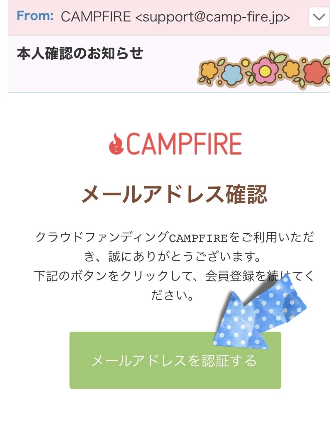 すぐに「CAMPFIRE」からメールが送信されますので、「本文内のメールアドレスを認証する」をクリック