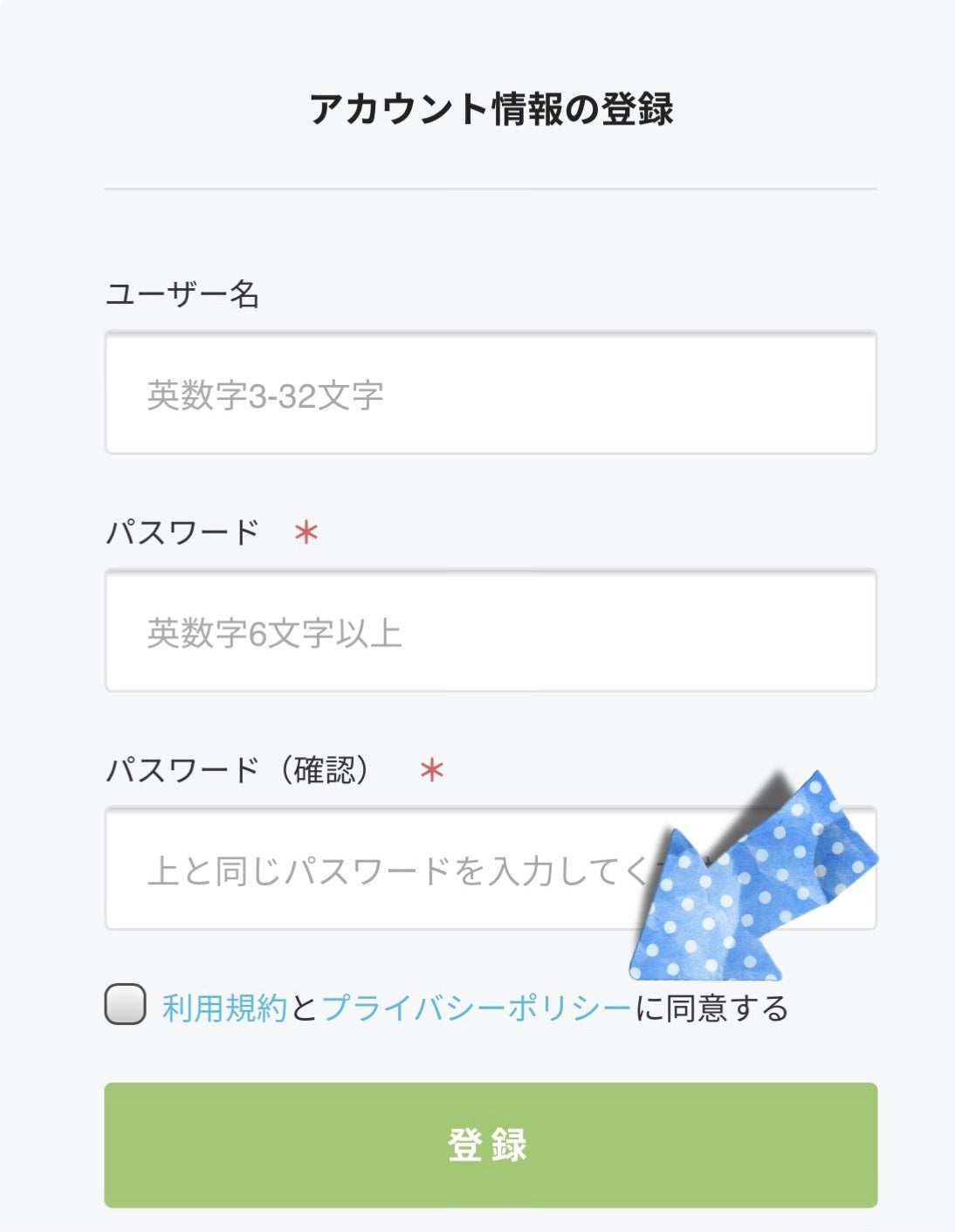 その後、「アカウント情報の登録」のユーザー名とパスワードを入力