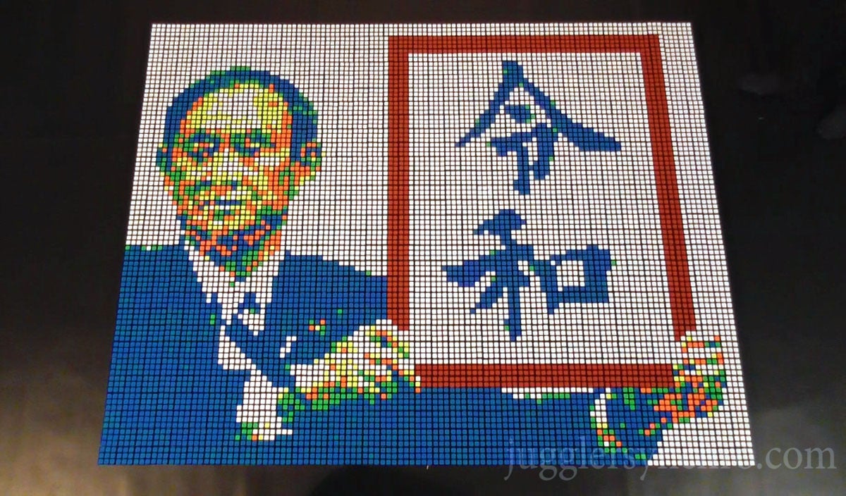 また最近は一般的にルービックキューブと呼ばれる6面立体パズルを複数組み合わせて絵や文字を描く「キューブアート」の第一人者として、数々の作品(「マリオ」「世界の名画」「アマビエ」「河野太郎」など多数!)を世に送り出し、メディアの注目を集めてきました。1面にだけ絵を描くのではなく、立体であることを活かして 「2面に同時に絵を描く」というシンクロニシティ独自の手法で、 見る角度によって全く違う2枚の絵を描く、 という新たな境地も切り開きました。