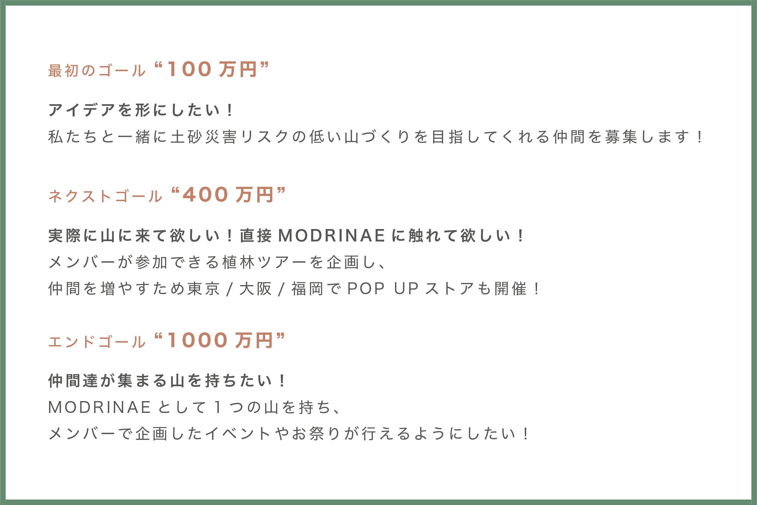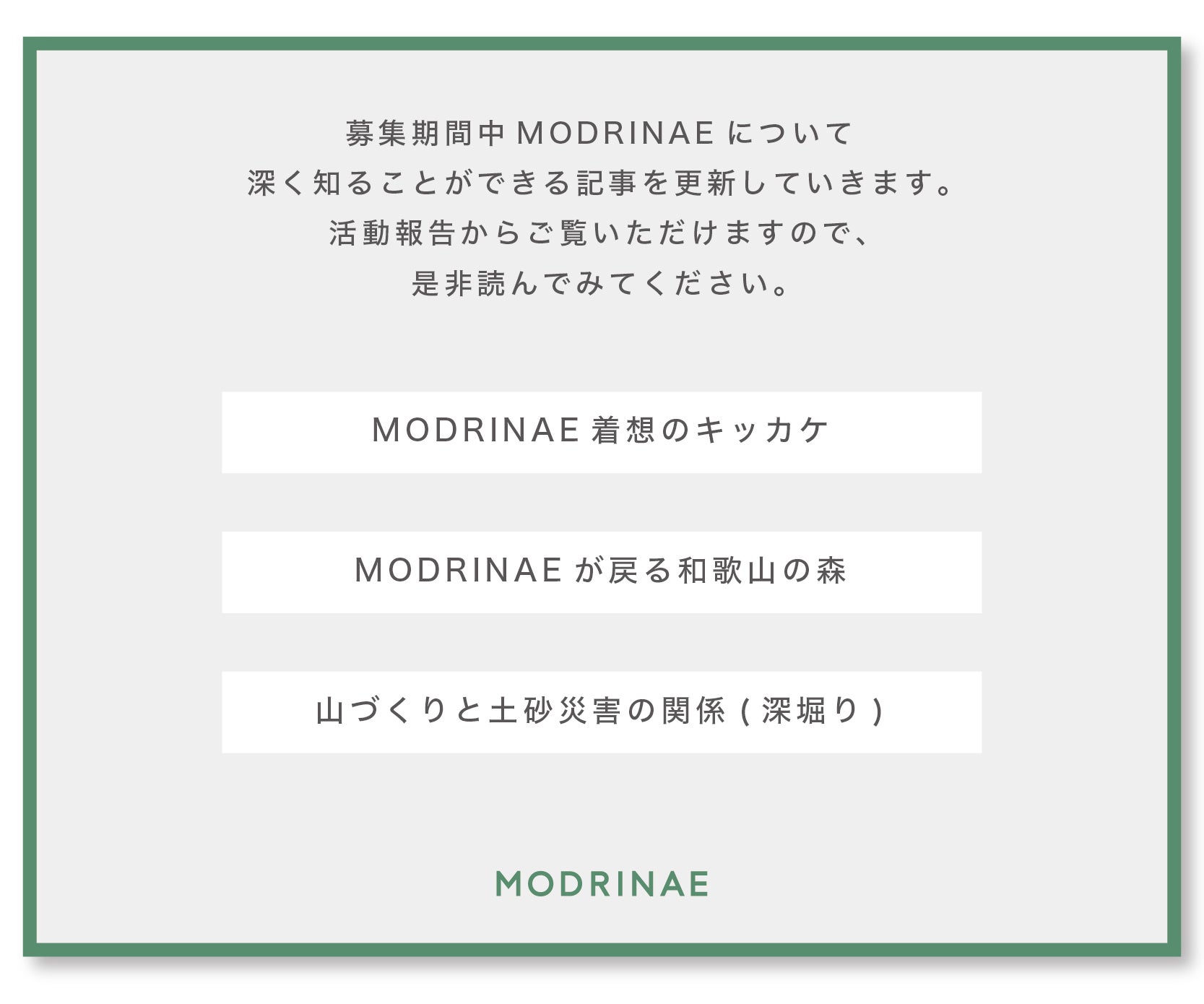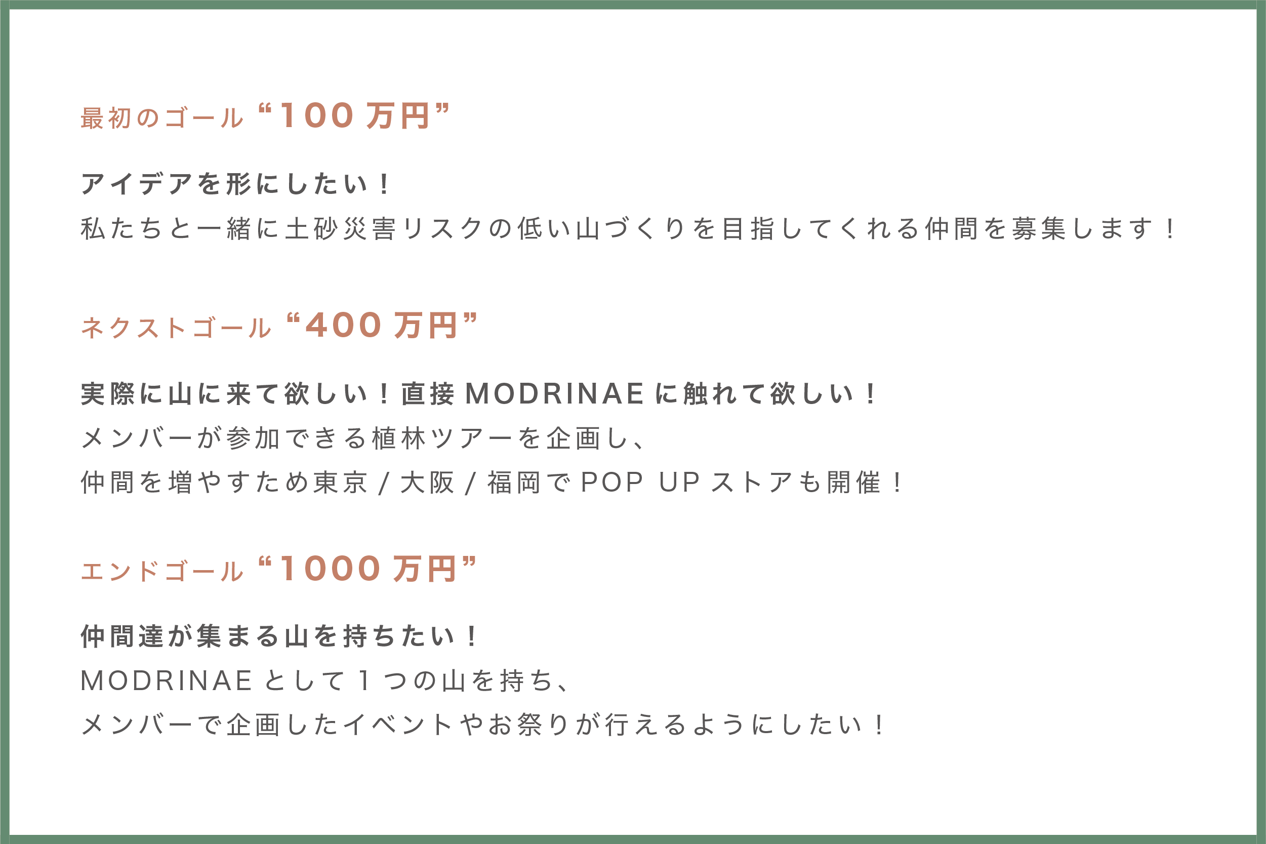 2021/06/28 21:092021年6月26日をもちまして「MODRINAE」のクラウドファンディングが終了いたしました。ご支援・ご声援をいただいた皆様に、スタッフ一同心より御礼申し上げます。135名の方々より1,376,780円のご支援をいただきました。また期間中には、商品やサービスについて多くのアイディアもいただきました。「MODRINAE」は皆さまご自身が豊かな山づくりに直接的に参加することができる、新しいカタチの観葉植物。山に植える苗をどうしたらお家で安心して育てられるか、どうしたらより一層愛着がわくか等、いただいたお声を1つ1つ大切に、工夫を重ねて参ります。ご支援いただいた皆さま、是非ご自宅にMODRINAEが届く日を是非是非楽しみにお待ちくださいね!今後ともどうぞよろしくお願いいたします。 もっと見る