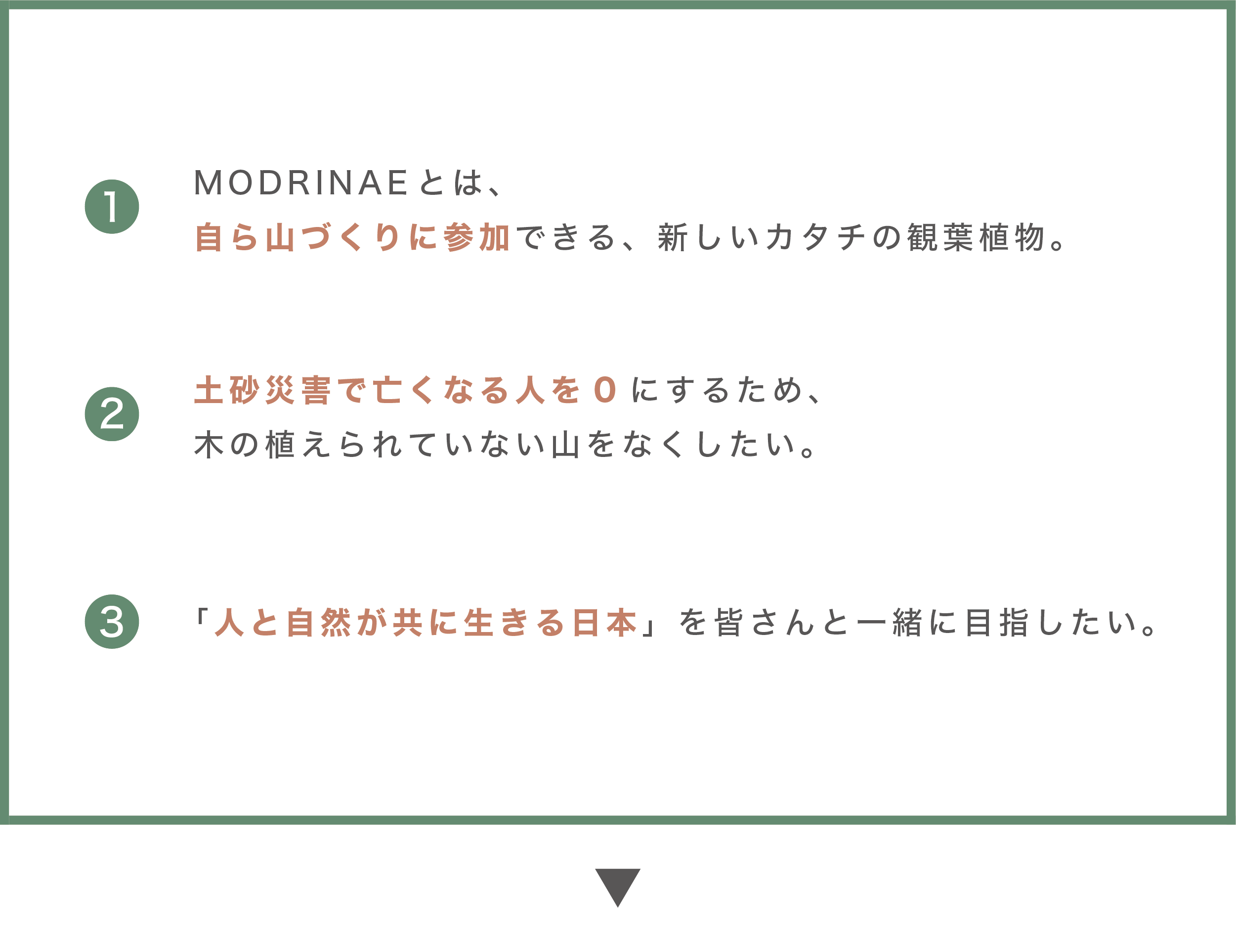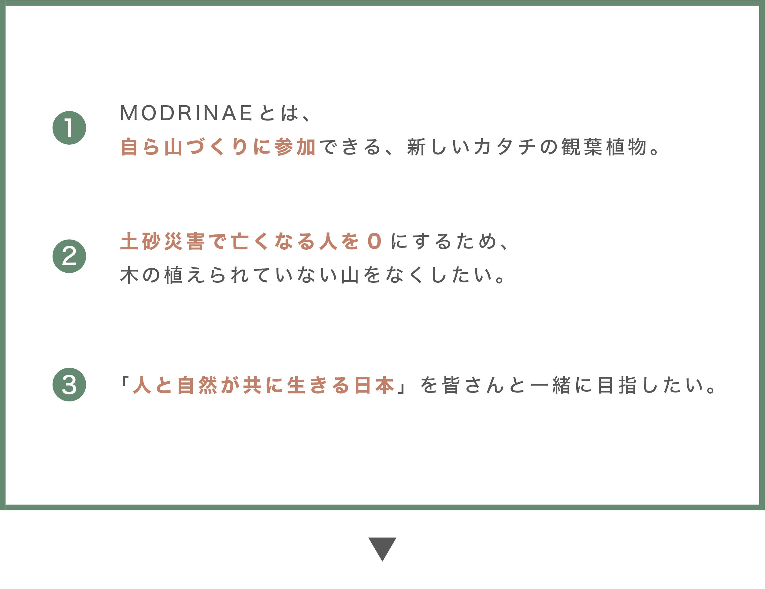MODRINAEは、苗を育てることで「直接豊かな山づくりに貢献できる」そんな「新しい森林保全のカタチ」を作ります。