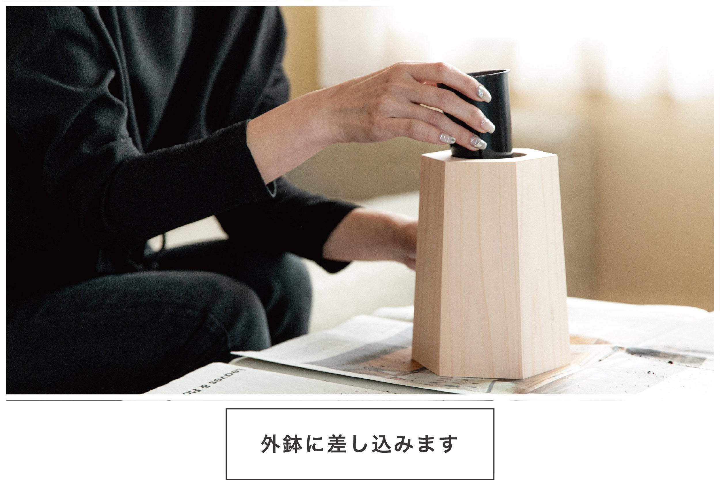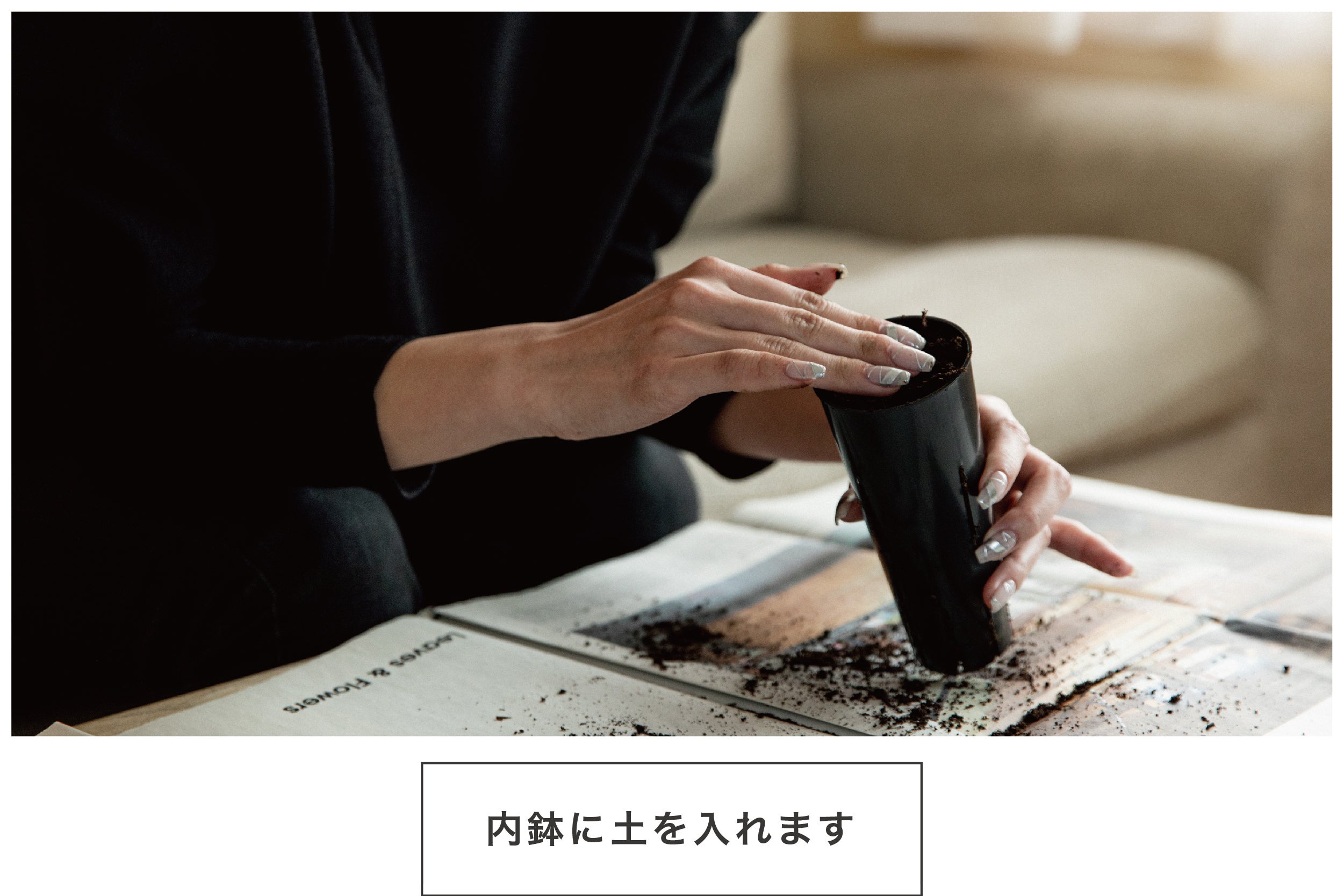 まずは、内鉢に土を詰めて、外鉢に差し込みます。
