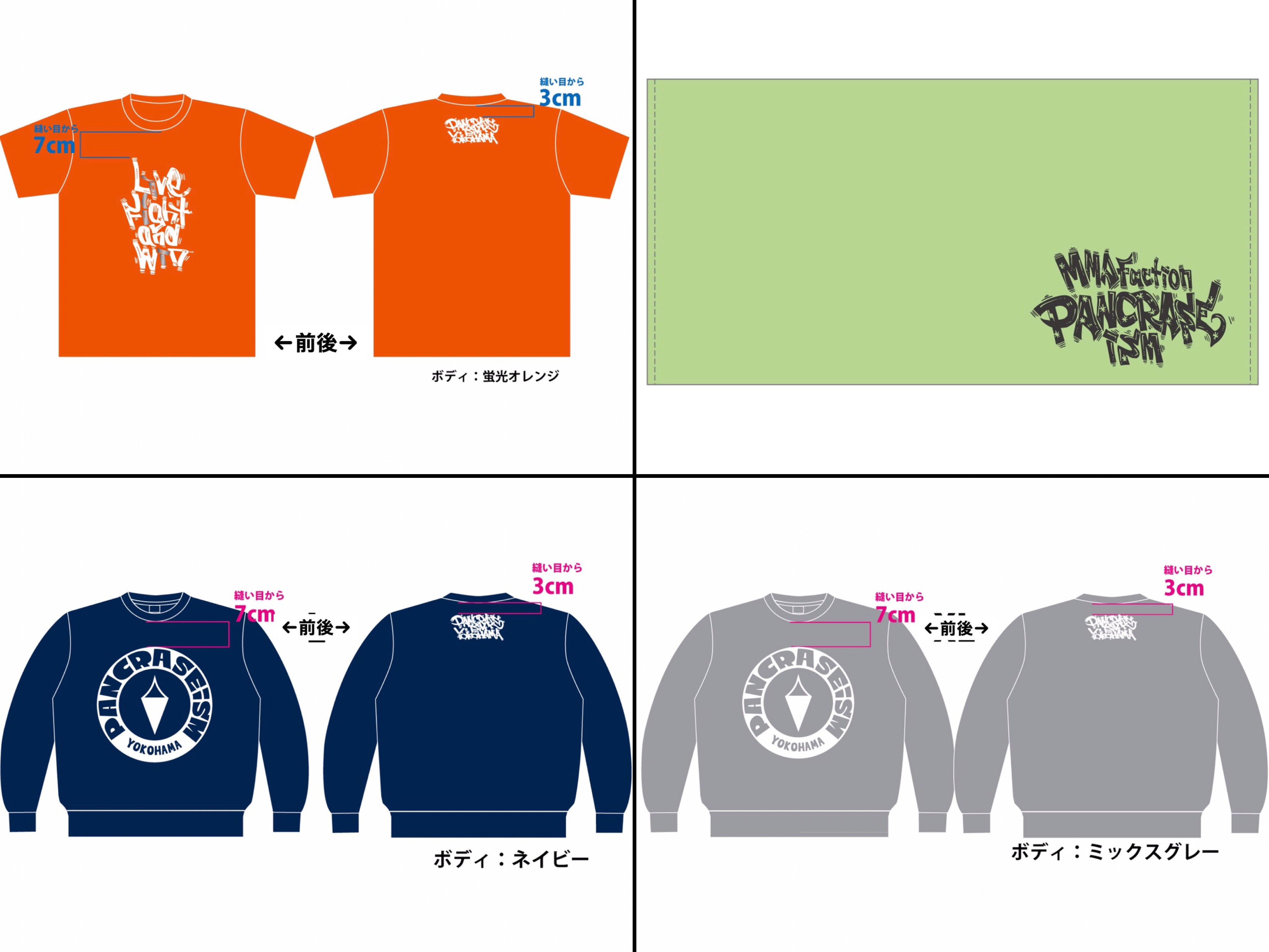 小口と致しまして、自主制作ののTシャツ、タオル、トレーナー、フーディ、ジップパーカー各種です。