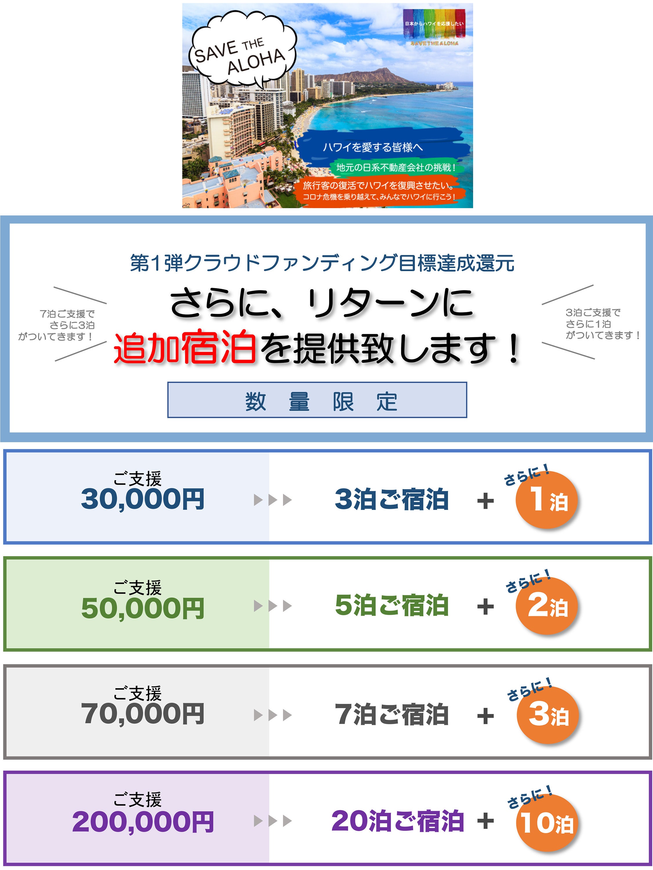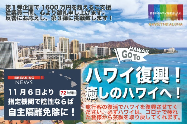 クラウドファンディング第一弾「ハワイ復興、コロナ危機を乗り越えみんなの愛するハワイに行こう!」で、コンドミニアム宿泊券の返礼を出させて頂き、おかげさまで目標金額を上回る、ご支援1600万円・639名様を達成できました。従業員一同、心より感謝しております。