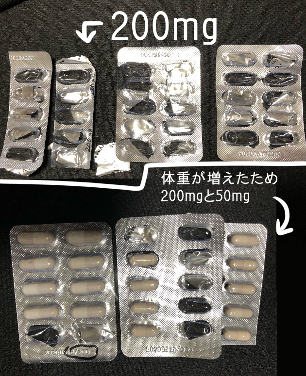 このお薬は、マロンの現在の体重だと1kgにつき100mgとされていてるので、マロンの現段階の体重は2kgなので、一日200mg(体重により増減ありますが)を84日間投薬し続ける治療になります。