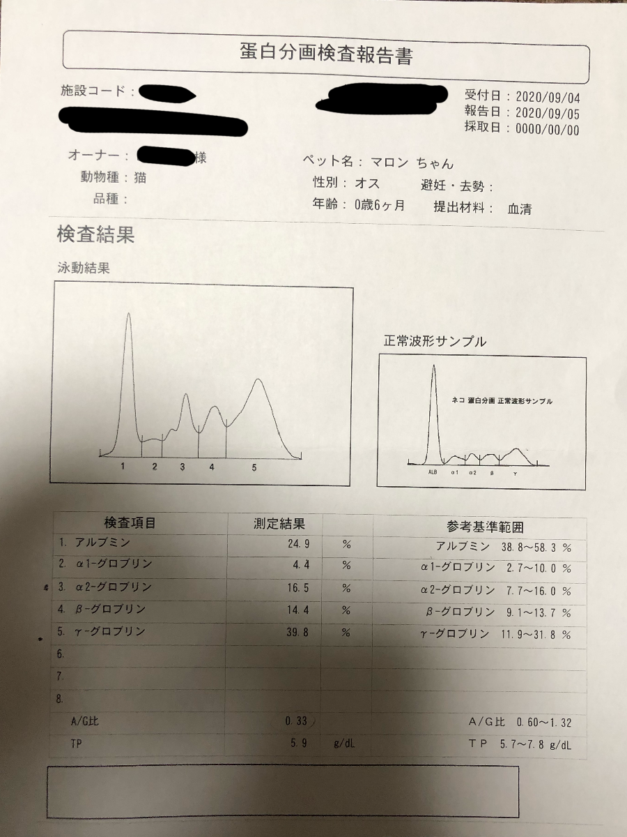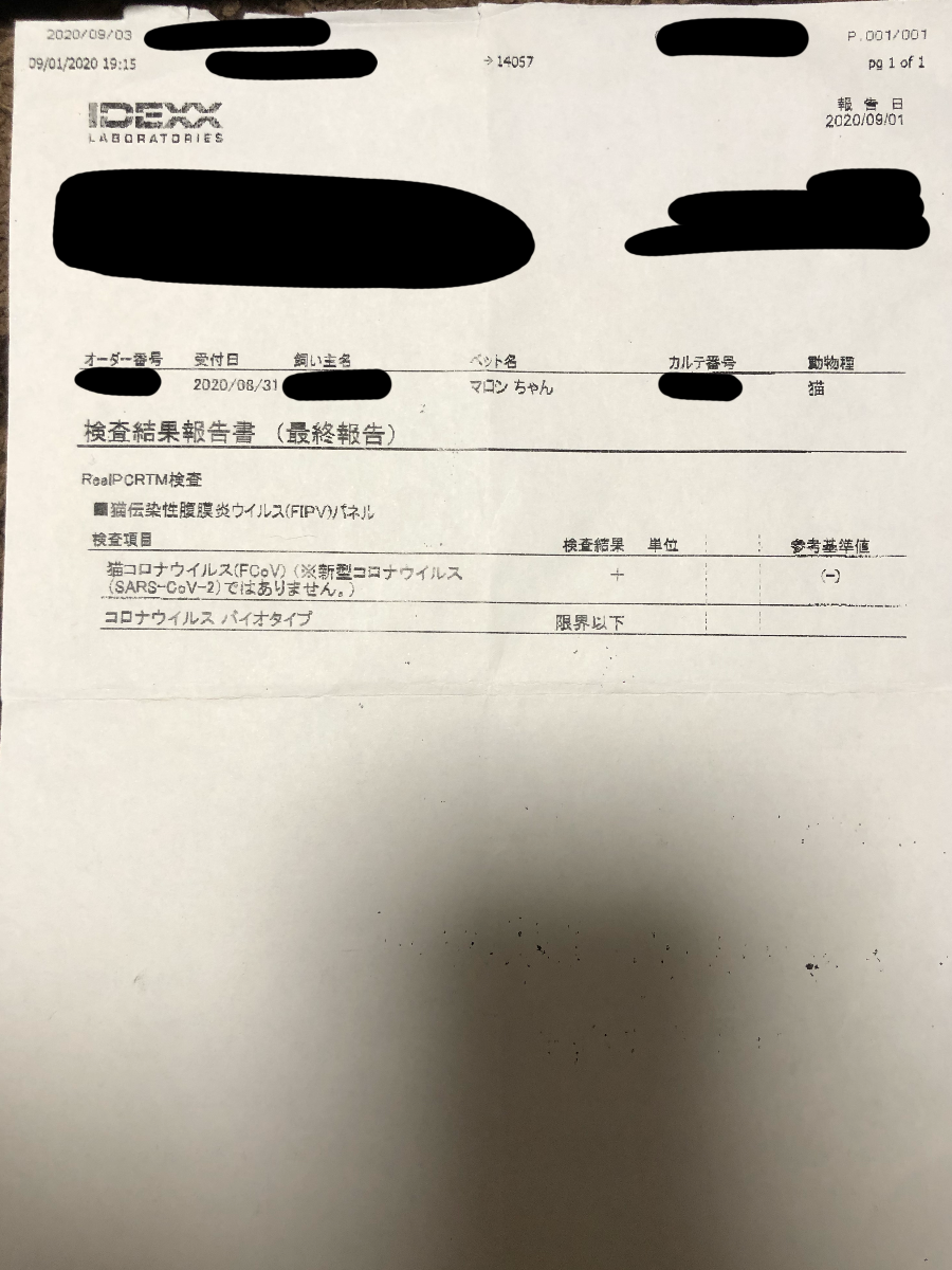 1枚目 こちらはFIPかどうかの検査をした時の結果と費用になります。