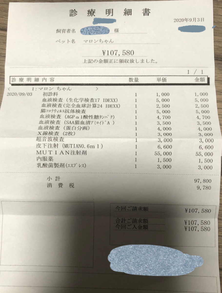 また、84日分の薬代購入費、投薬開始から定期的な検査代(エコー、血液検査、その他のお薬代)貧血の治療費(FCVリキッド)免疫力をアップする為のサプリメントや増血剤などの費用がかかります。