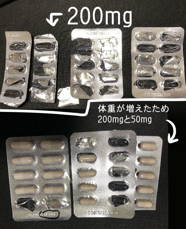 このお薬は、マロンの現在の体重だと1kgにつき100mgとされていてるので、マロンの現段階の体重は2kgなので、一日200mg(体重により増減ありますが)を84日間投薬し続ける治療になります。