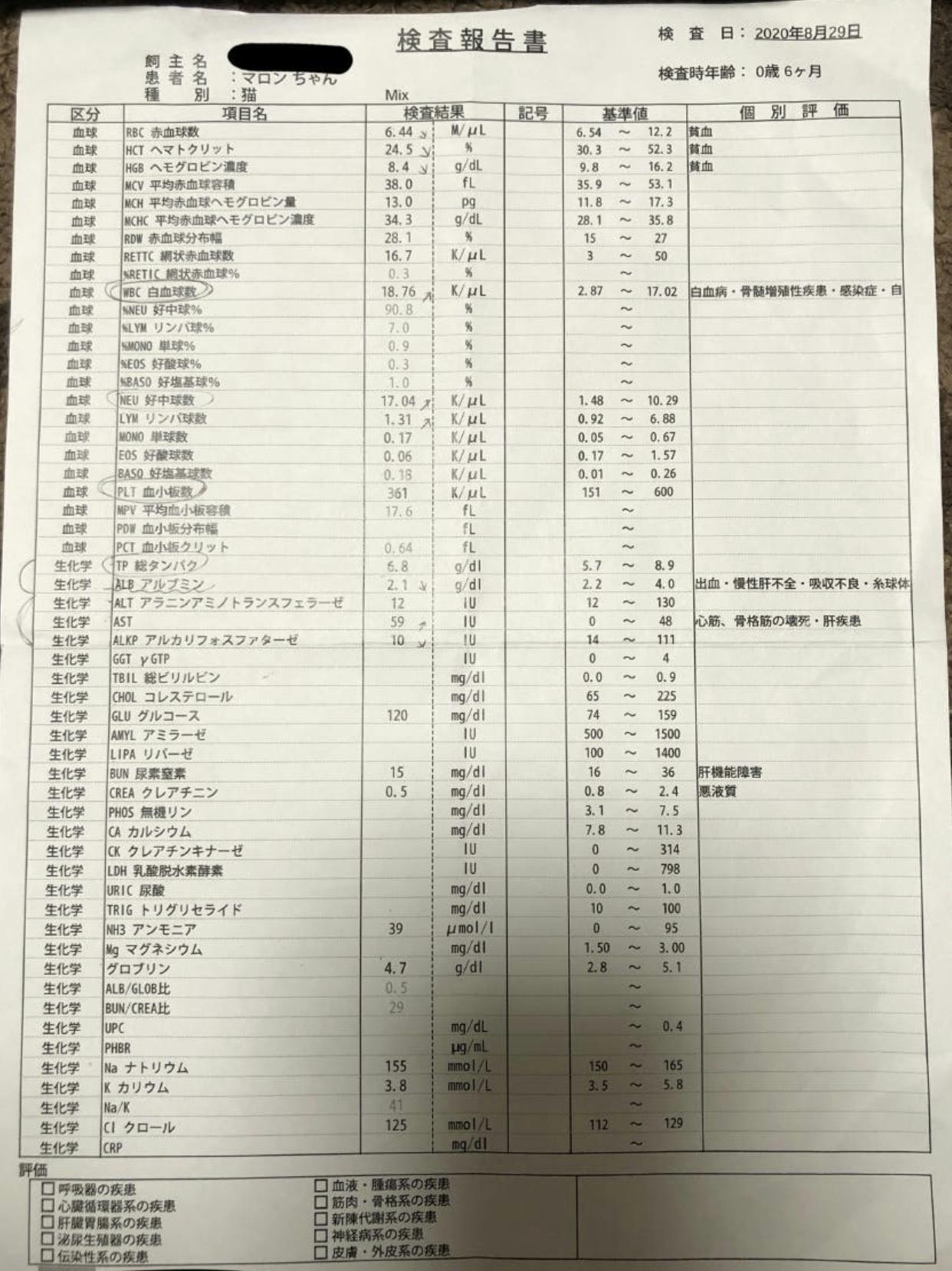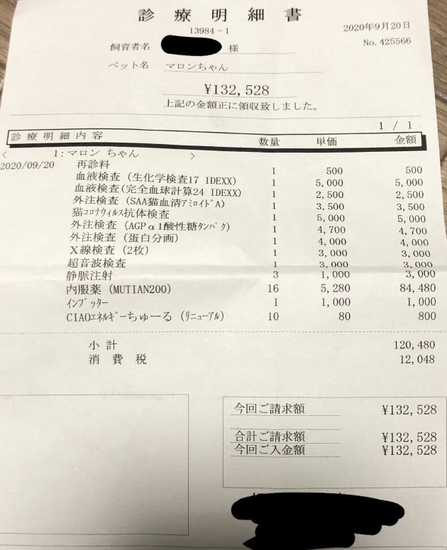 また、84日分の薬代購入費、投薬開始から定期的な検査代(エコー、血液検査、その他のお薬代)貧血の治療費(FCVリキッド)免疫力をアップする為のサプリメントや増血剤などの費用がかかります。