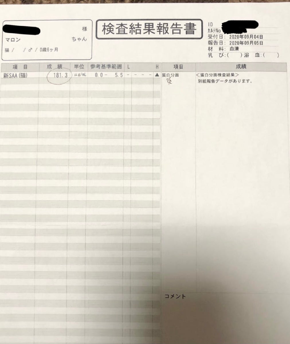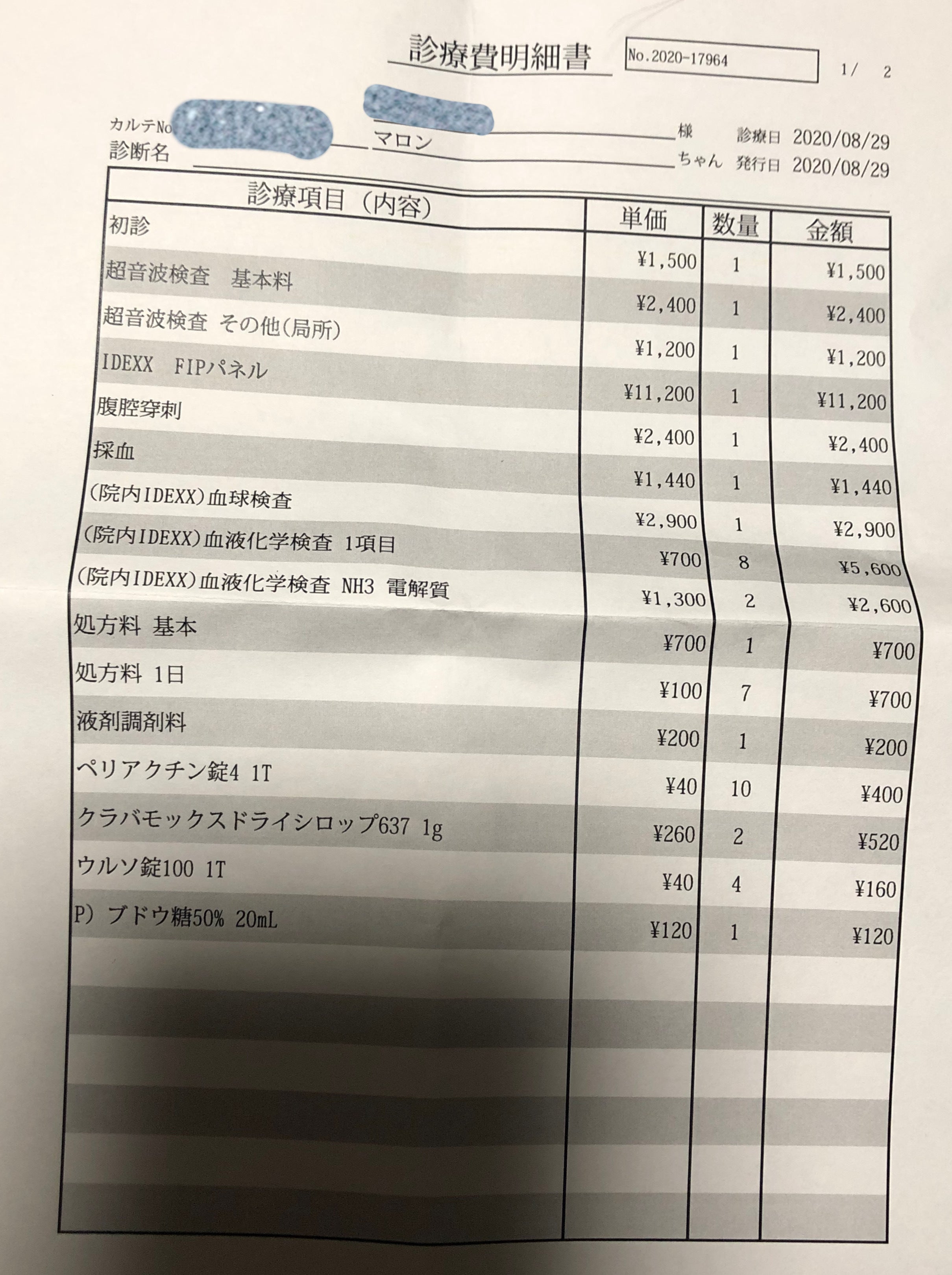 1枚目 こちらはFIPかどうかの検査をした時の結果と費用になります。