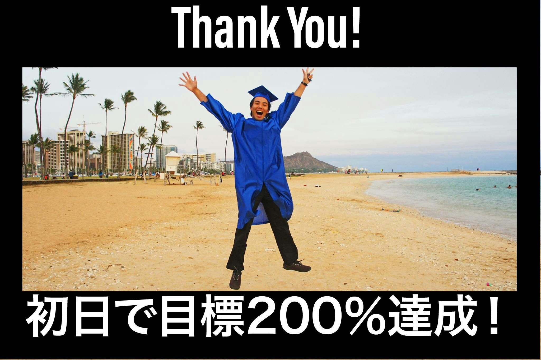 皆様の暖かいご支援のおかげで当初掲げていた目標の200%を初日で突破し目標達成することができました。本当に暖かいご支援を行っていただき有り難うございました!