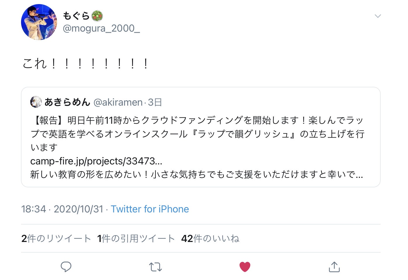 高校生RAP選手権など様々なMC BATTLEで活躍し、YouTuber(チャンネル登録者3.6万人※11月3日時点)としても人気を誇り、慶應大学法学部に通うラッパーもぐら君が『ラップで韻グリッシュ』のプロジェクトをツイッターでシェアしてくださいました。