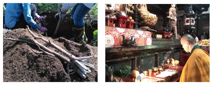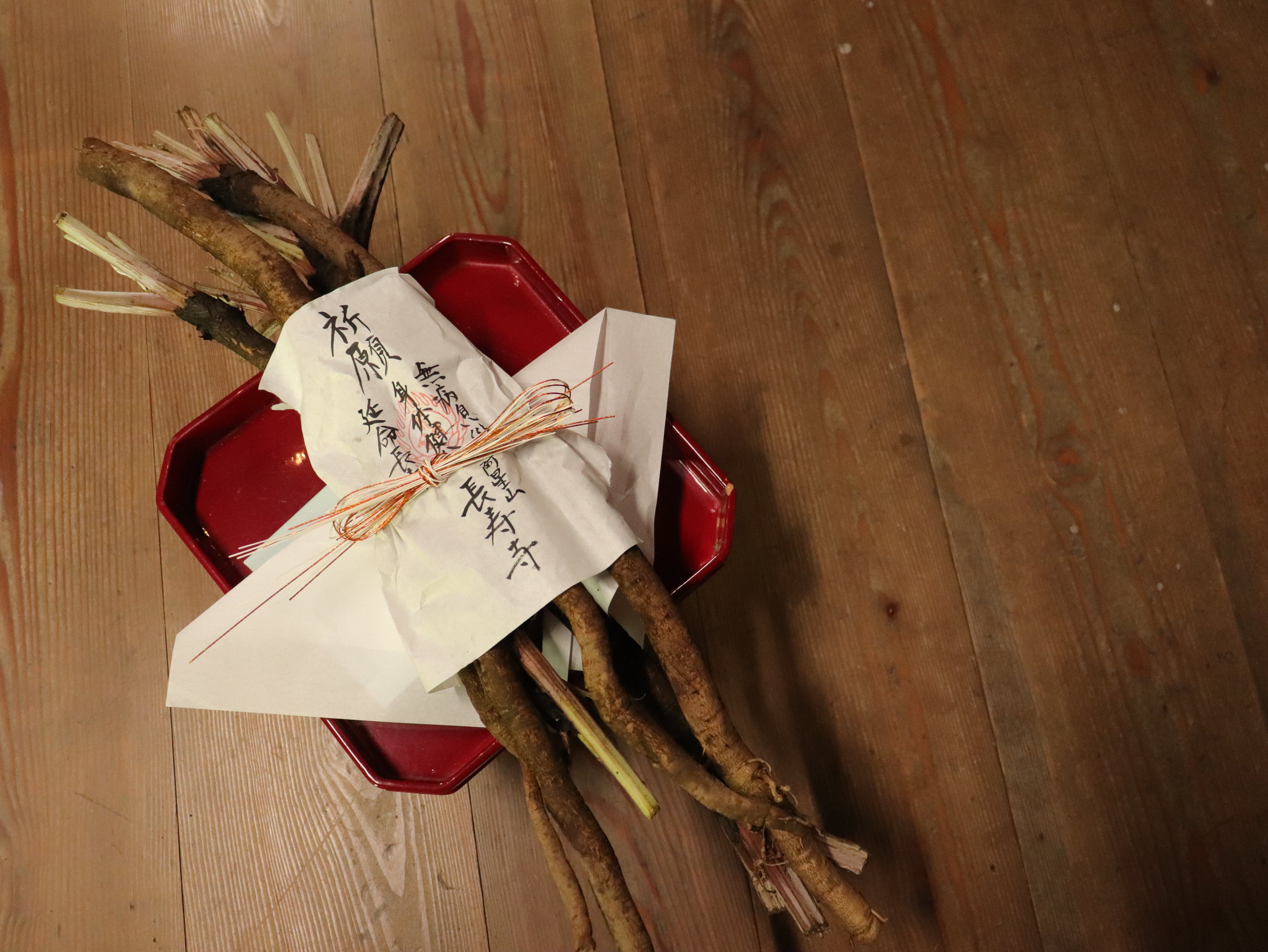 収穫後すぐに、湖南三山の一つである長壽寺にて藤支住職に、この地に根付いた人々とともに、訪れる人々の健康・長寿、子どもの安寧を収穫後のごぼうに祈願いただきました。