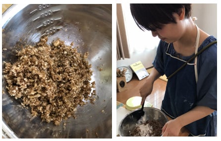 ごぼうを細かくした粉末とクッキーの材料を混ぜ合わせます。