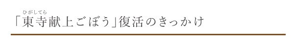 私が住む東寺地域には、昭和天皇即位後の大嘗祭で献上されたごぼうがあります。しかし、地域の高齢化が進み、手間暇と労力がかかるごぼうは自家用のみで市場には出荷されなくなり、今もこの状況が続いています。