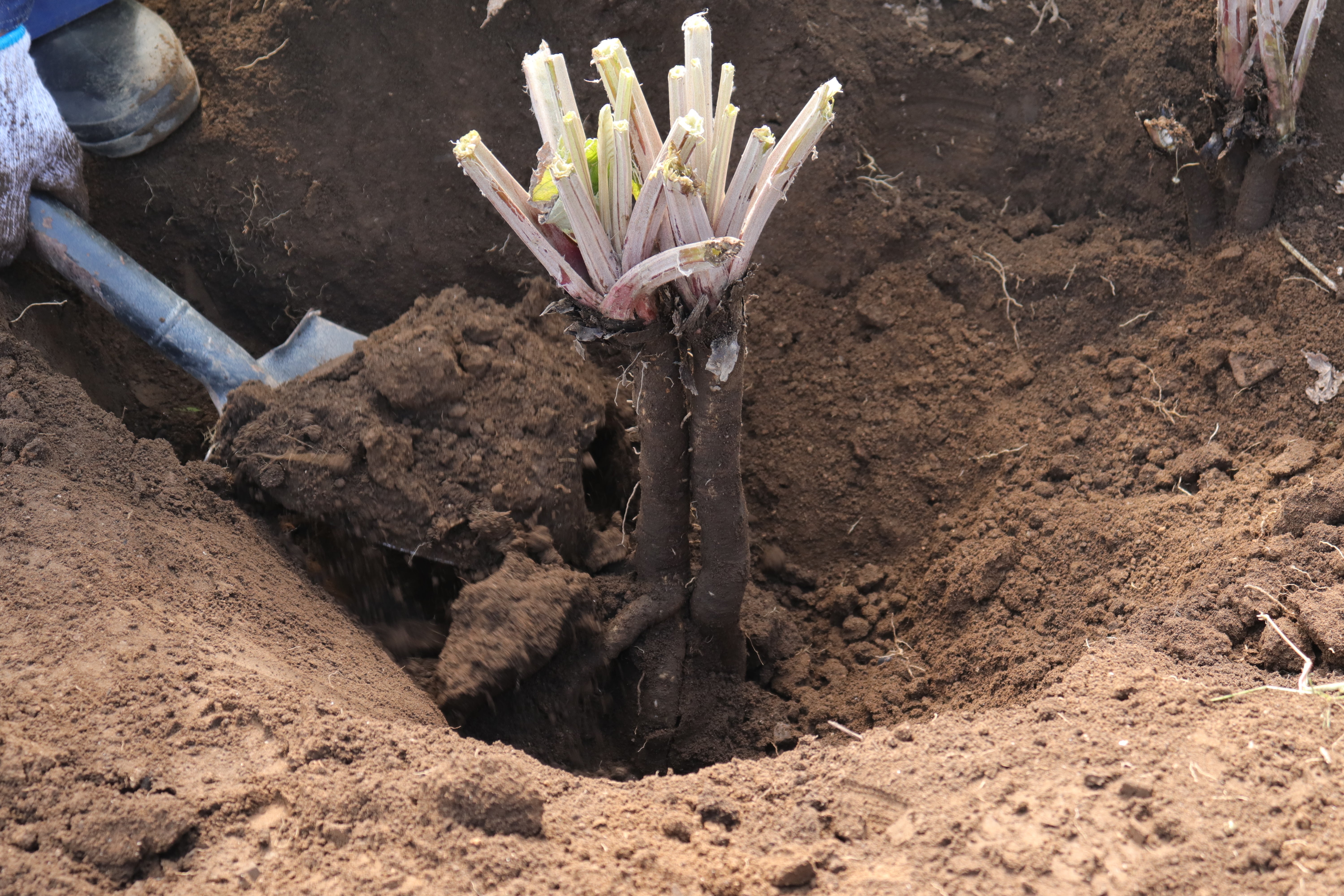2020年3月、東寺の農業者 森田幹雄さんの協力を得て、秋の収穫時期まで栽培をお願いしました。ごぼうの栽培は初めてということでしたが、ごぼうが真っすぐに育つように1mほど深く畑をスコップで掘り起こしてから、ごぼうの生育に大切な肥料を混ぜ畝を作っていただきました。