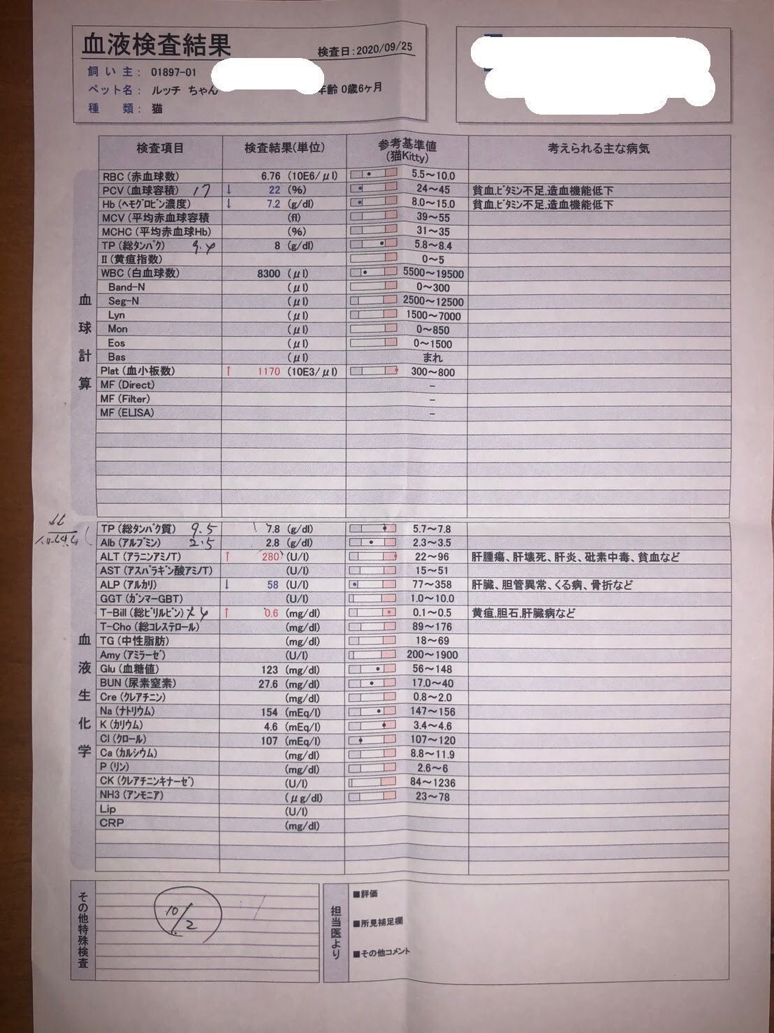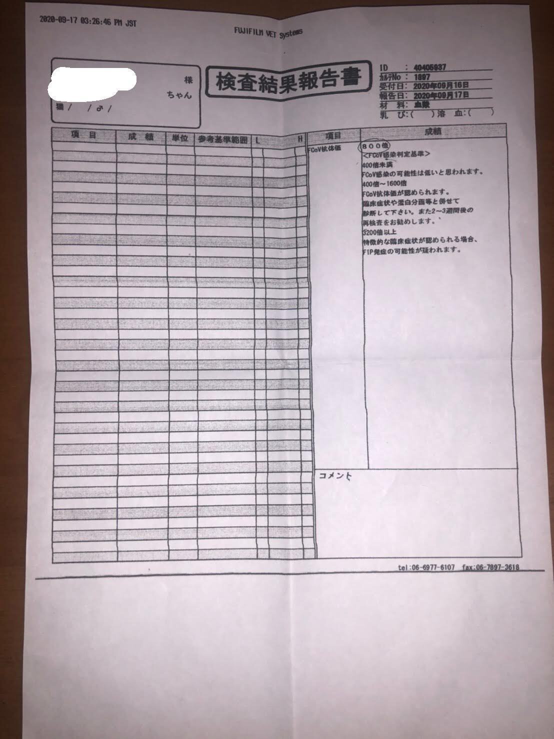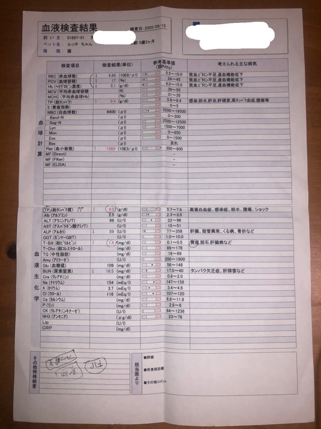 血液検査をした所、貧血・発熱・ぶどう膜炎・黄疸の数値が高い事、ルーちゃんの歳も考えると、FIPの疑いがあると言われ、抗体検査に出しました。