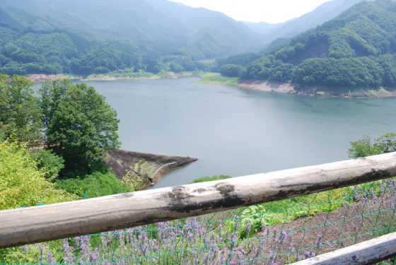写真は渡良瀬渓谷の名所の一つ、草木湖です。青々と水をたたえる湖の周りには遊歩道が整備されていて、散策できるようになっています。また、ほとりには星野富弘さんの作品を常設展示する富弘美術館があり、この美術館は四角の中にあぶくのような丸い部屋をいくつも配置したユニークな建築でも知られています。