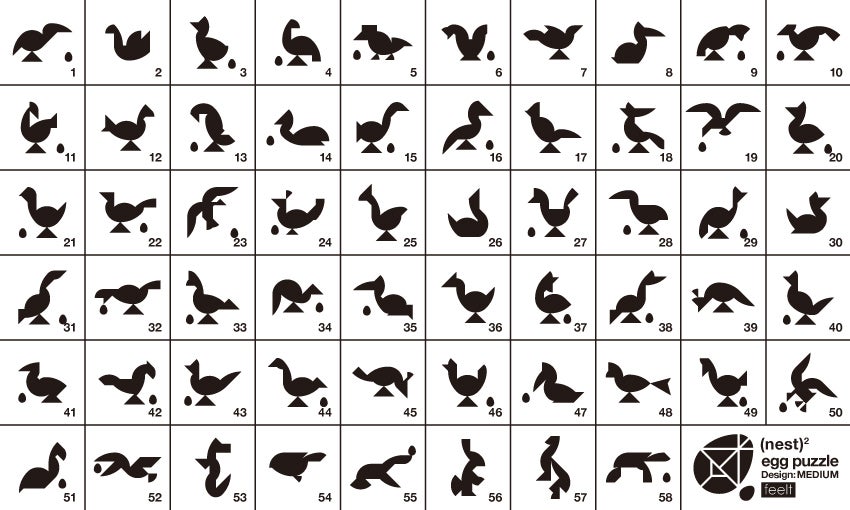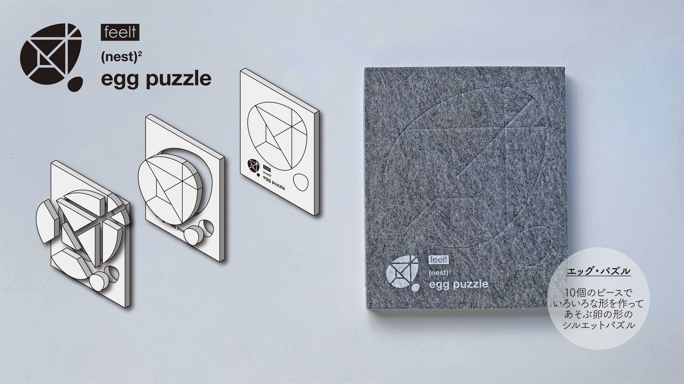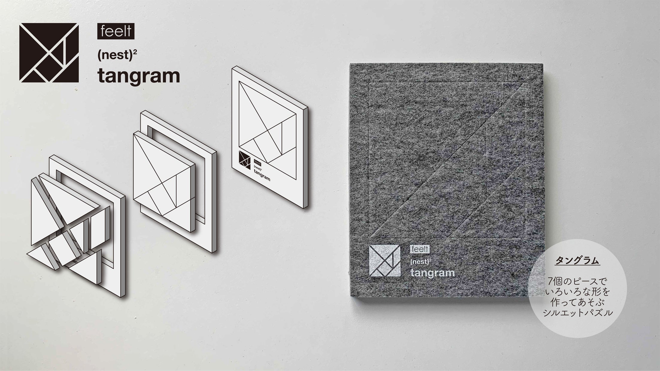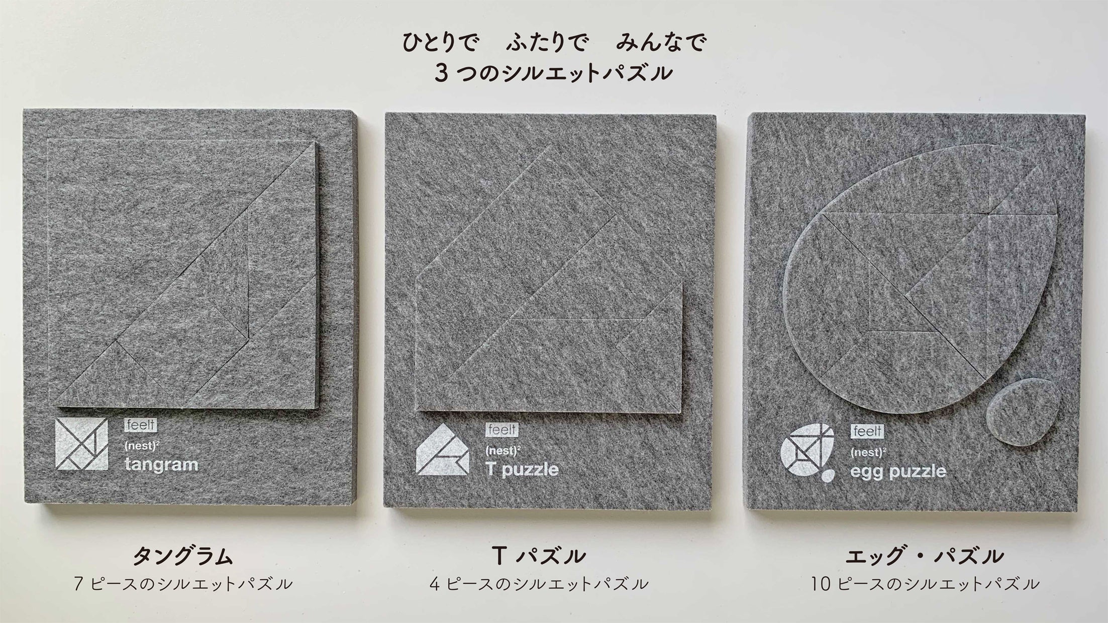 (nest)2は硬質フェルトでできた、3種類(タングラム・Tパズル・エッグ パズル)のシルエットパズルです。ひとりでも、ふたりでも、みんなでも楽しく遊べます。使用しないときは、150 x 180mmの1枚の板としてコンパクトに収納できます。