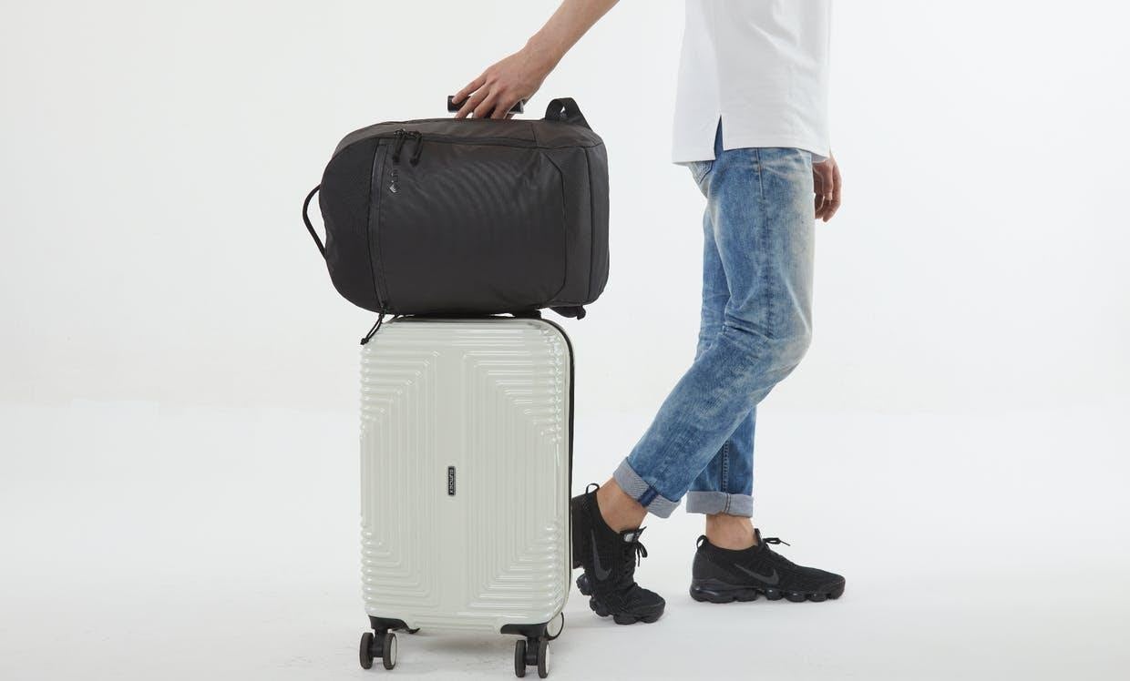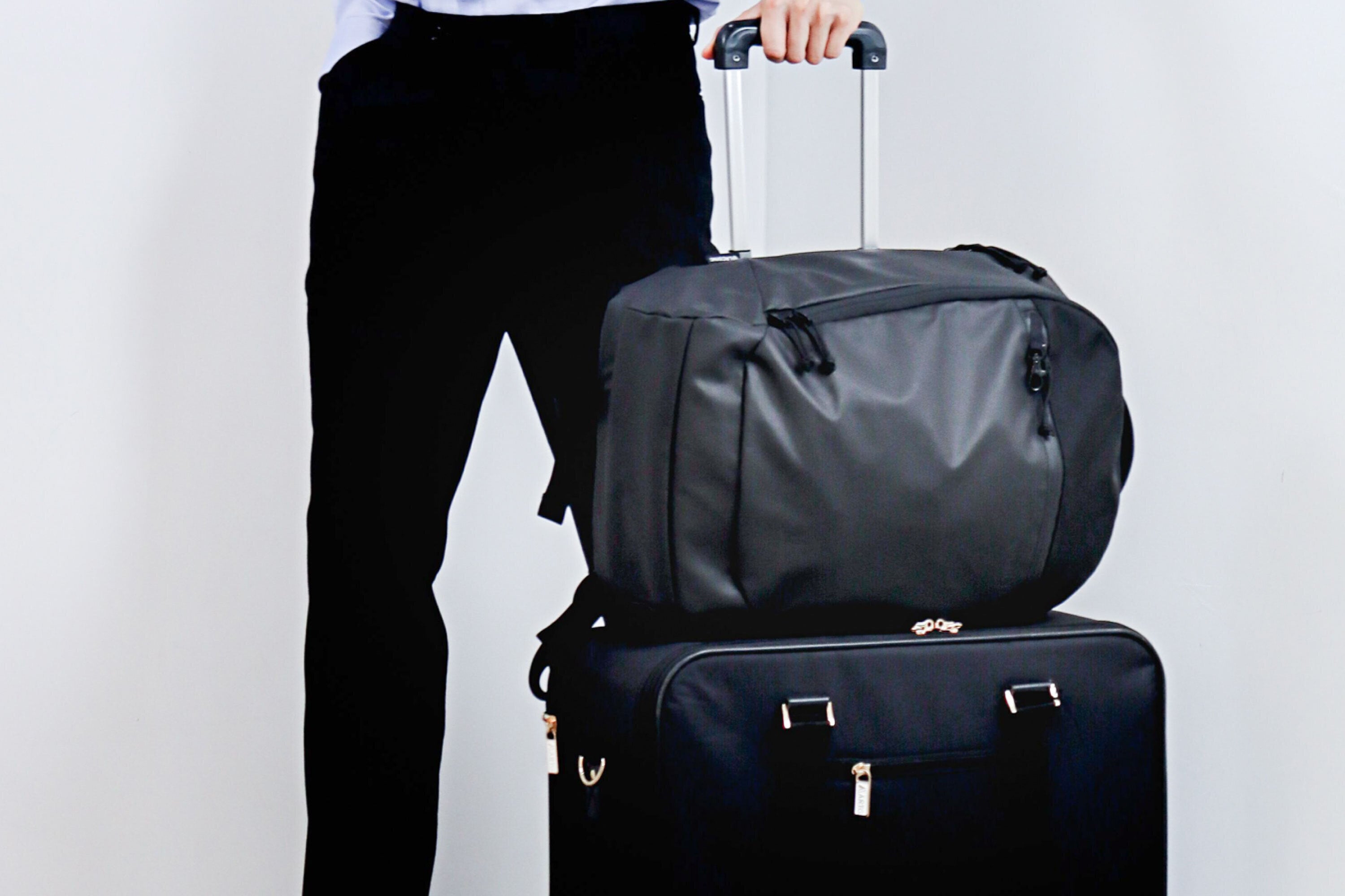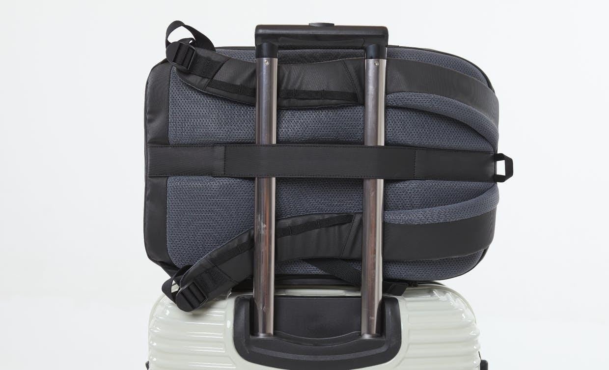 また、背面パネル中央にある隠しバンドを使うことで、スーツケースのハンドルにドッキングできます。