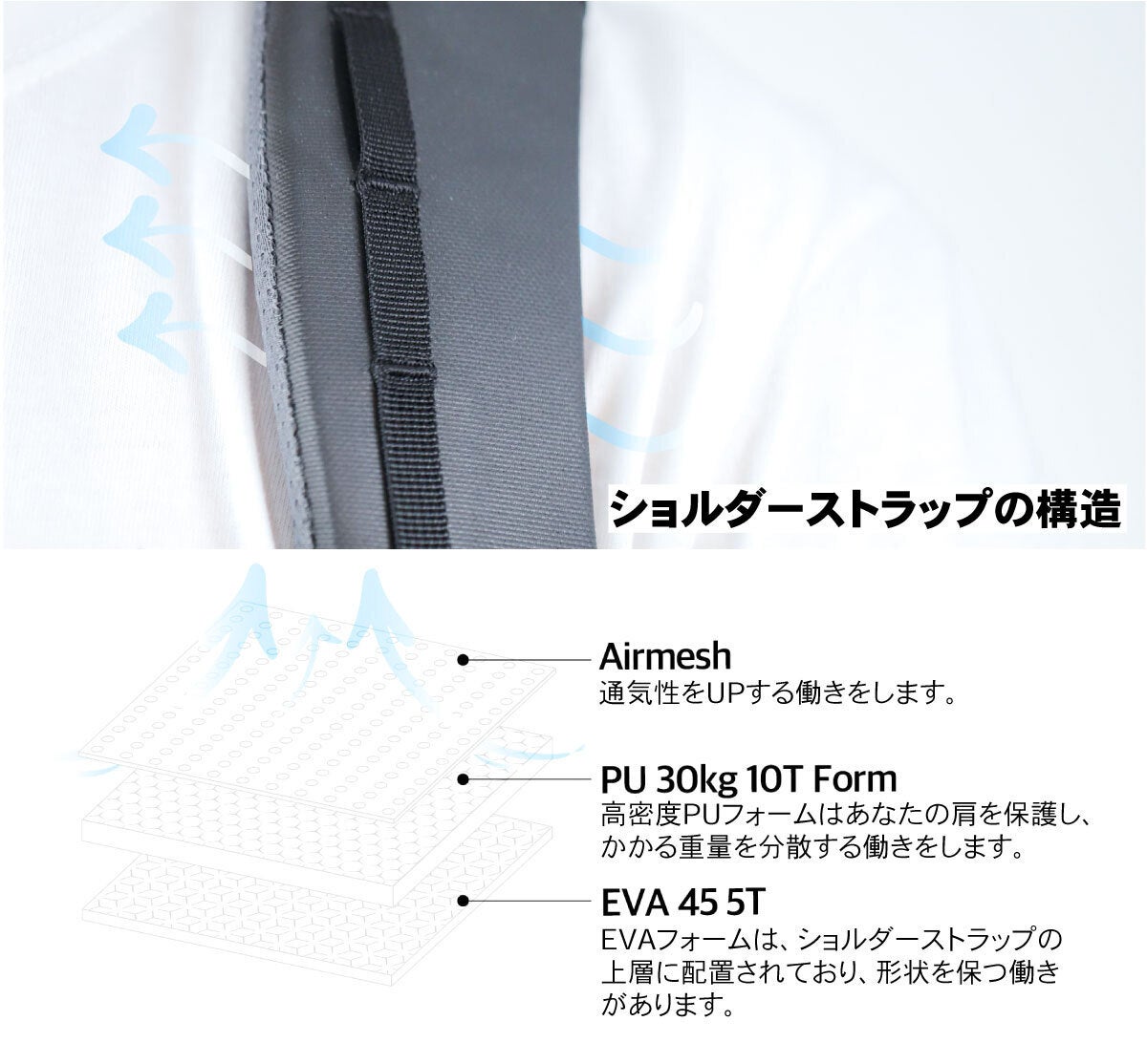 ショルダーストラップは、快適性を生み出します。3レイヤー構造で、各レイヤーの働きにより、背負った際に形状を維持しつつ肩にかかる重量を分散します。また、エアメッシュにより通気性も確保され、不快感を軽減します。