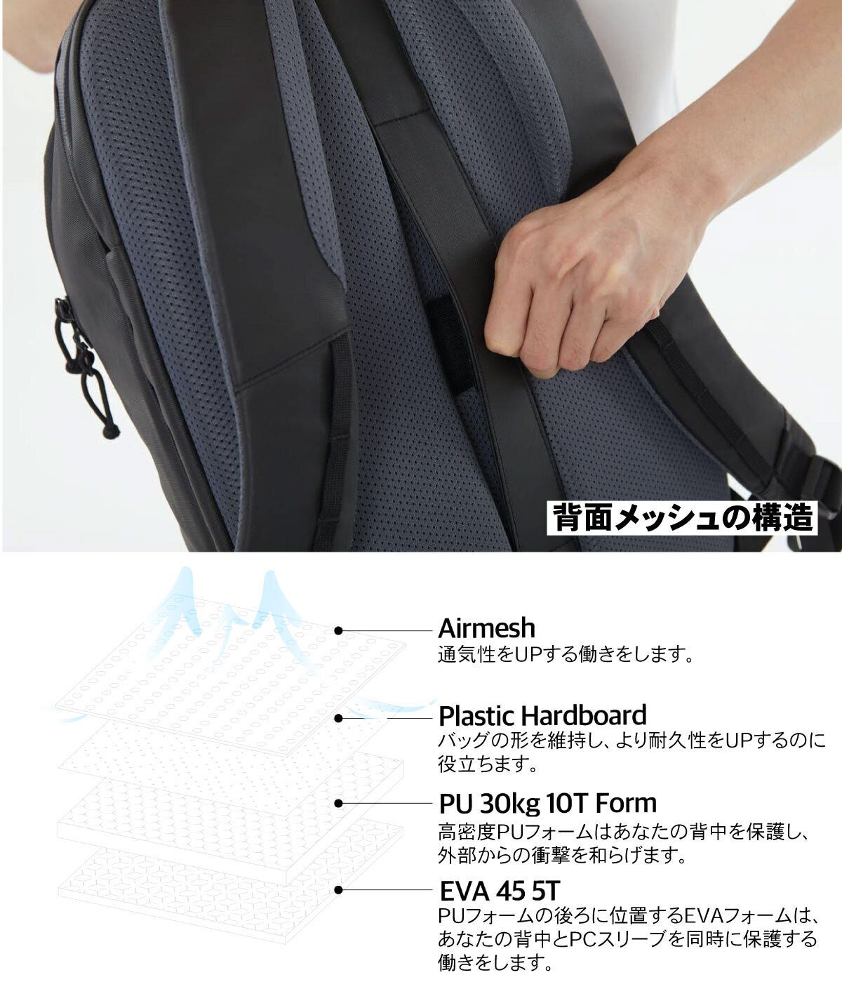 一方の背面パネルは20mmの厚さの4レイヤー構造で、プラスチック製ハードボードが追加され、形状の維持と、耐久性UPに貢献しています。こちらも同様にエアメッシュ素材により通気性も確保され、不快な蒸れ感を軽減します。