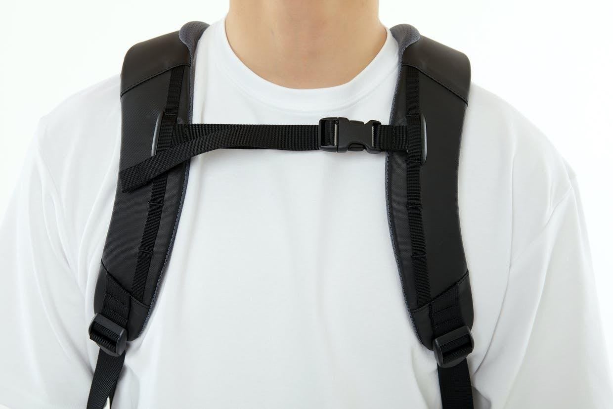 また、ショルダーストラップは15mmと肉厚で、しっかり肩周りにフィット。そして登山用バックパックのように、体全体で支える構造のため、長時間背負っても快適に過ごすことができます。
