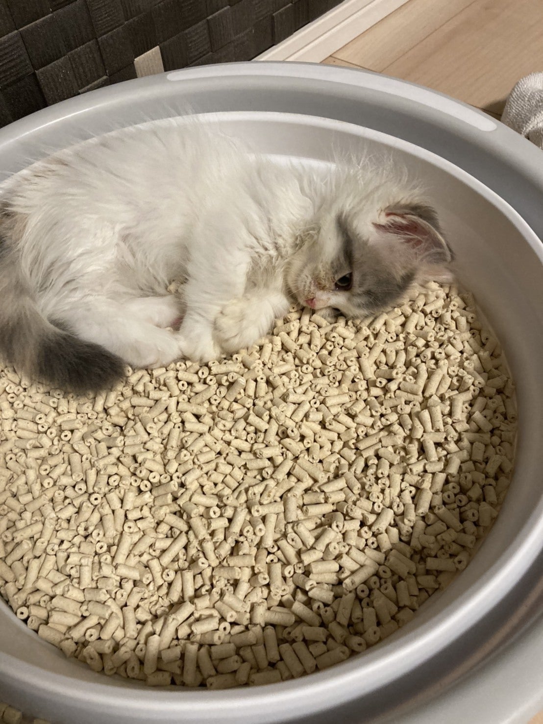 お腹が腹水で張り裂けそうなくらい膨張していて、高熱、呼吸も荒く、食欲も無い、常に貧血状態です。ぐったりしていて、いつもみたく元気におもちゃで遊ぶ気配もありません。