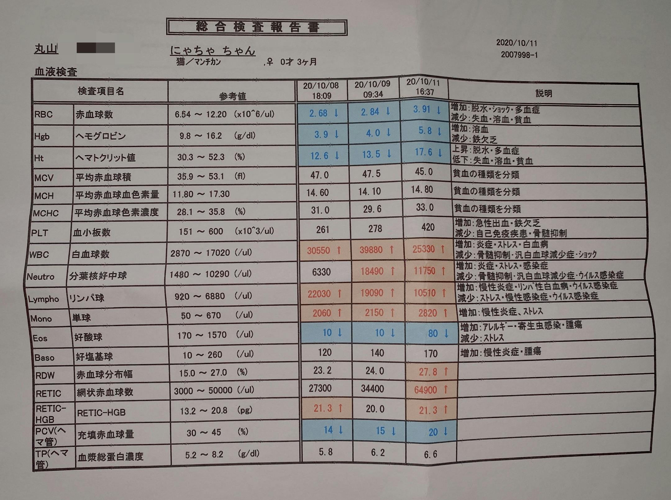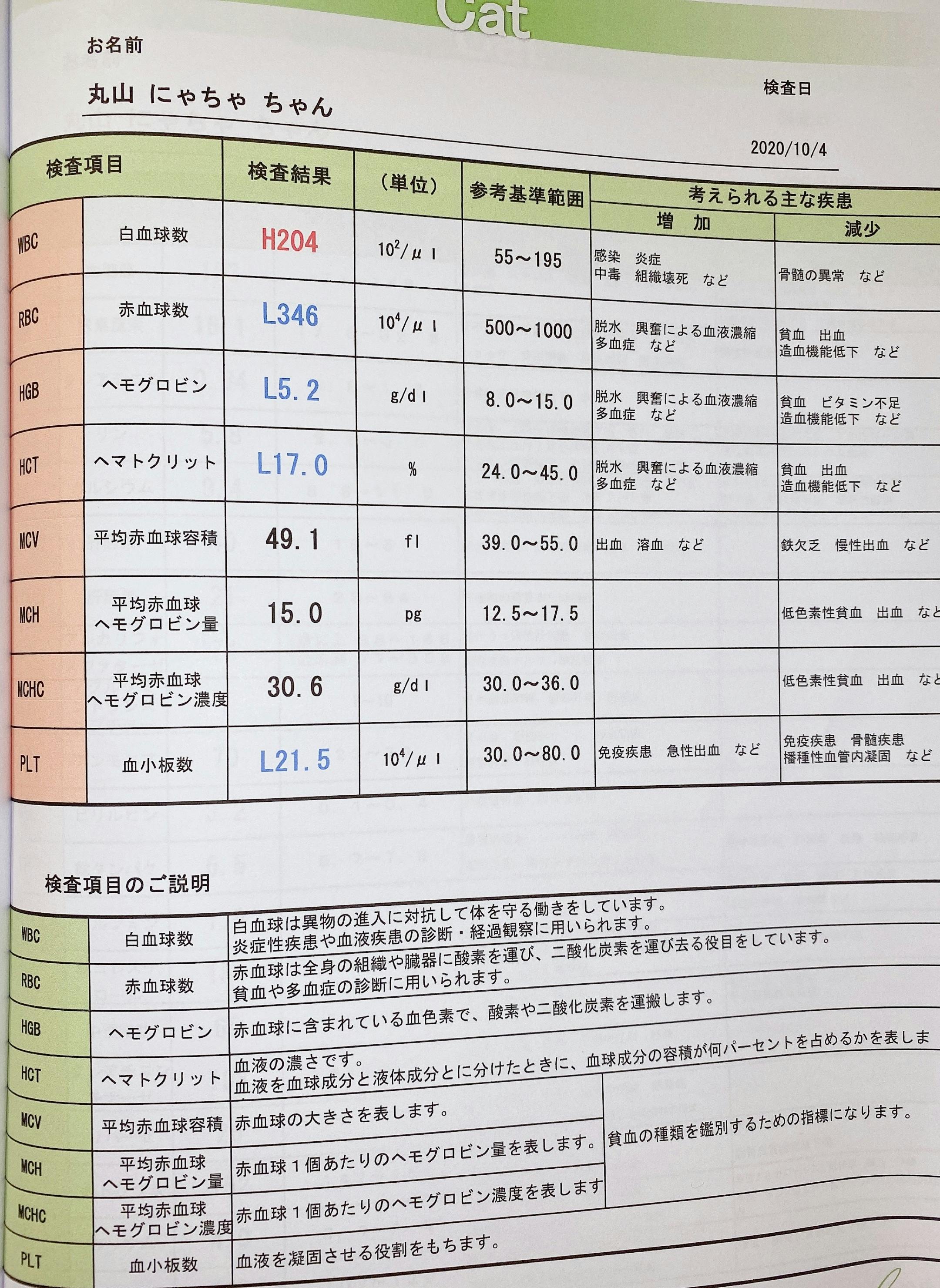ヘマトクリット値というものが一時12%代まで減少していました。それは重度の貧血で輸血ができる病院を探していたのですが、あいにくにゃちゃは珍しいB型の猫ちゃんでドナーさんが見つからず…ムティアン投薬を続けた結果、改善されました!