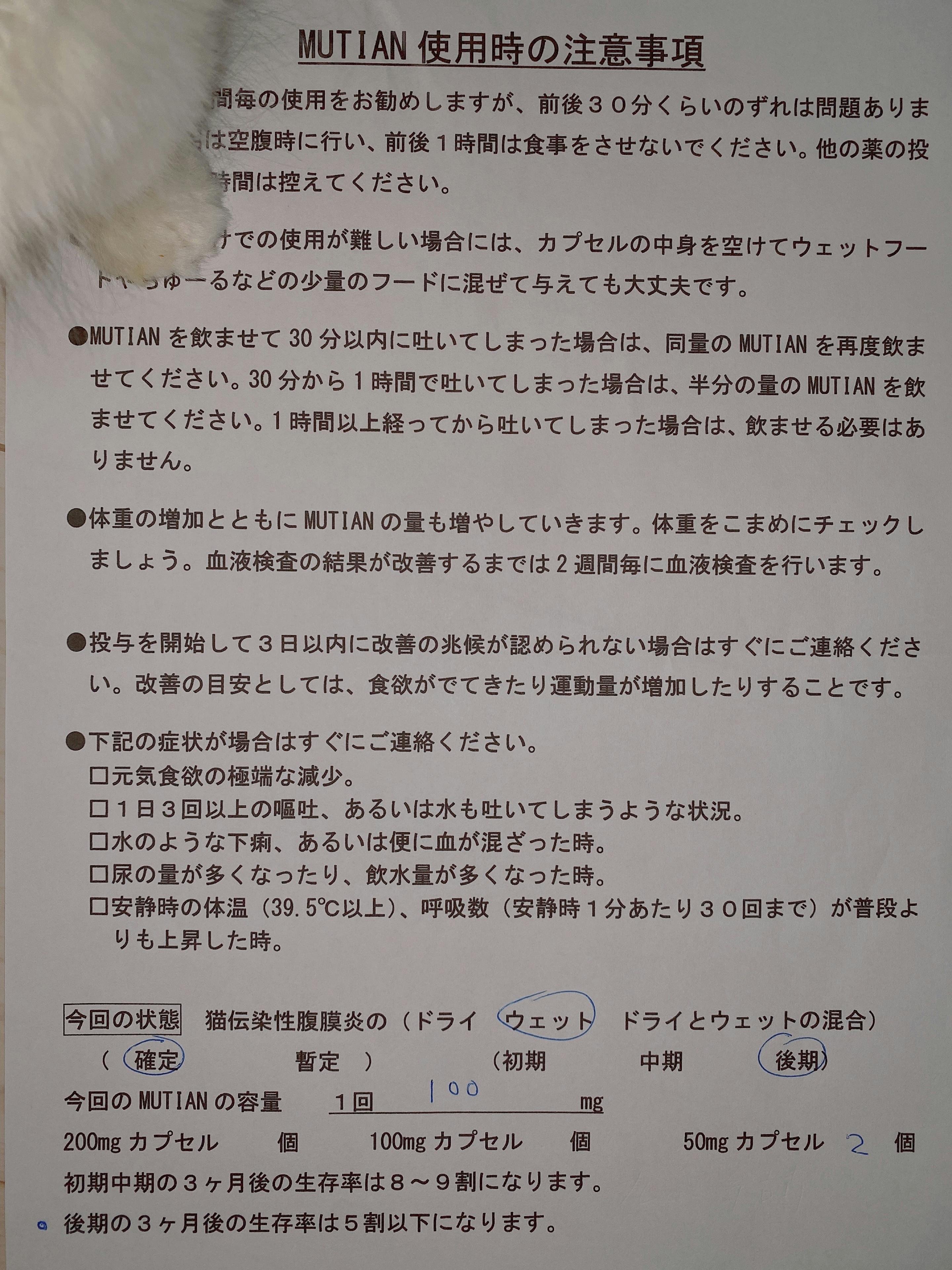 ムティアンは原則12週間連続投与が絶対条件であり、2週間に1回行う体重計測と検査の結果によって、投薬する量が変わっていきます。また途中で中断したりすると、1週目からやり直しになってしまいます。そして12週間の投薬が終了したのち、血液検査等の結果で正常値を保つことが出来ていると、FIPが再発しにくくなり、完治という事になります。