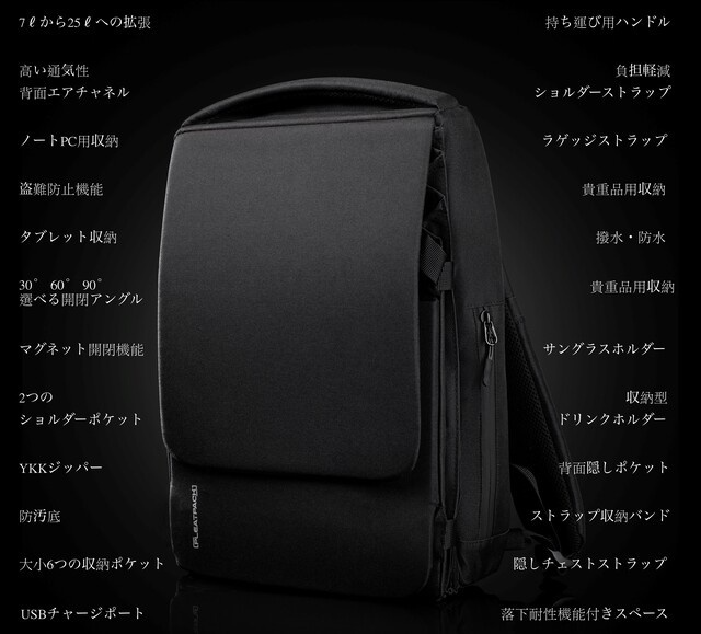 無駄は一切なし!シンプルを追求したスタイリッシュデザイン!バックに必要な機能は全て網羅!便利を極める20+の機能!ビジネスからアウトドアまで!最大25ℓの拡張機能!
