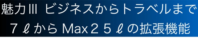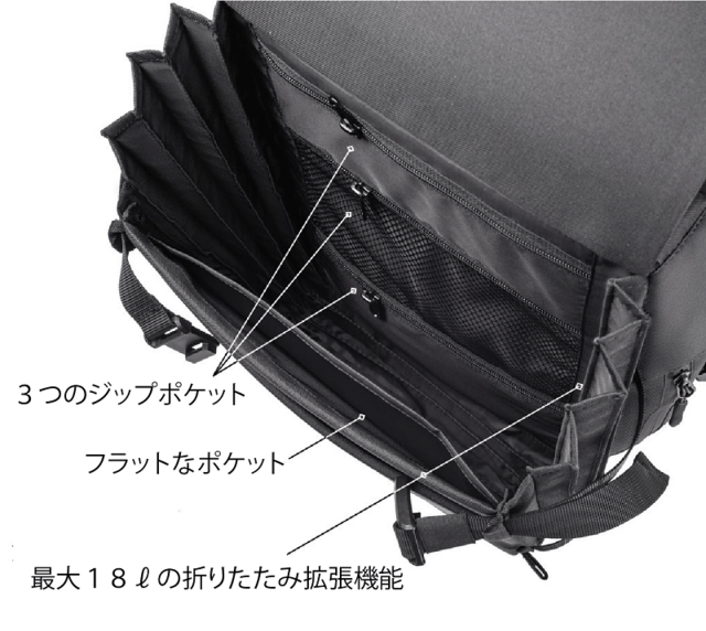 通常の拡張型バックパックと異なり、段階的に必要な分だけ拡張していくため、無駄にだぶついた印象を与えることもありません。