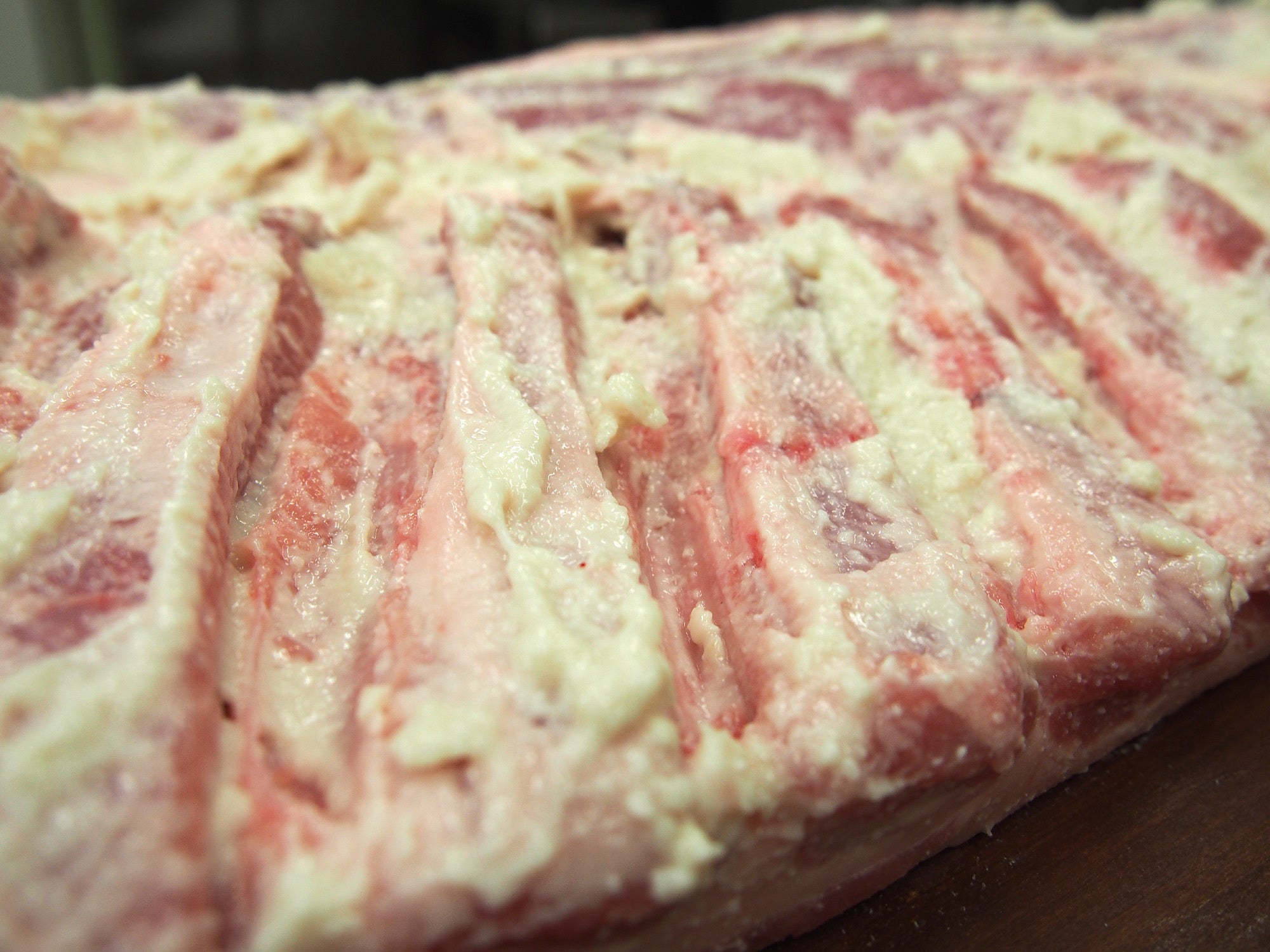 工房全体に広がる酒粕の香りのなか、厳選された豚のバラ肉に丁寧に丁寧に大吟醸酒・叶の酒粕を仕込んでいきます。