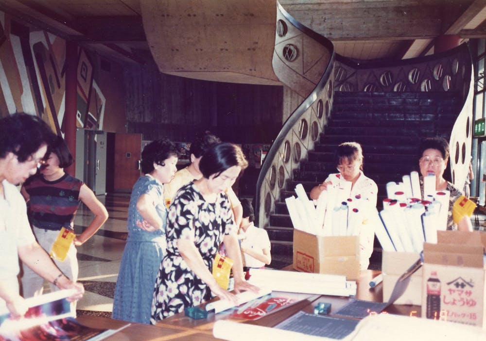 80年代後半には会員4000人を超え、年間9回公演するなどピークをむかえ市民の手で準備し運営する演劇活動が浸透しました。 音楽センターでの例会運営風景