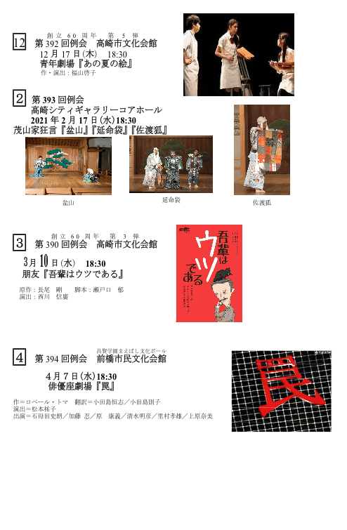 2月17日(水) 高崎シテイギャラリー 茂山家狂言「盆山」「延命袋」「佐渡狐」 3月 10日(水) 高崎市文化会館 朋友「吾輩はウツである」 4月 7日(水) 前橋市民文化会館 俳優座劇場「罠」