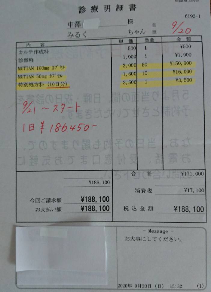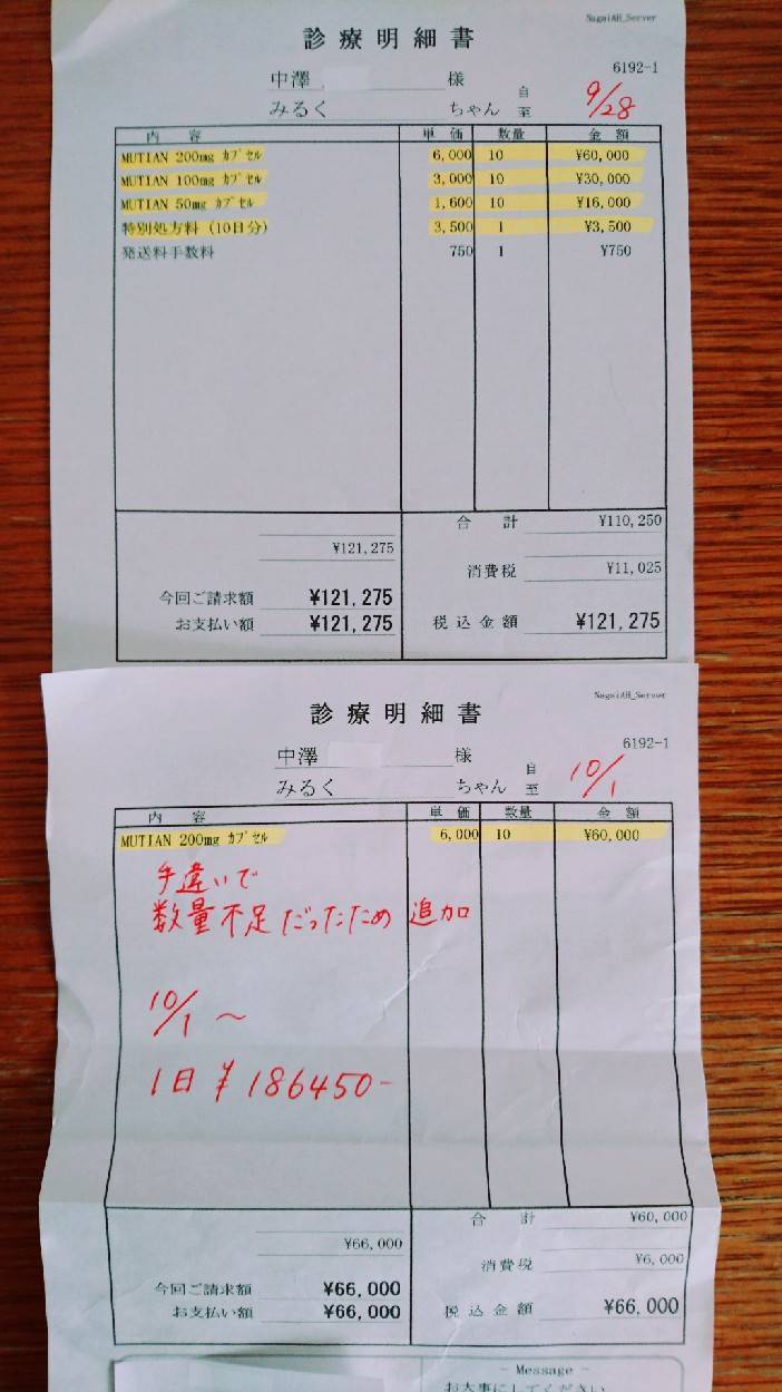 FIP中期とのことで、一刻の猶予もないため、投薬についての注意事項の指導を受け、MUTIAN10日分(¥186450)を処方してもらう。